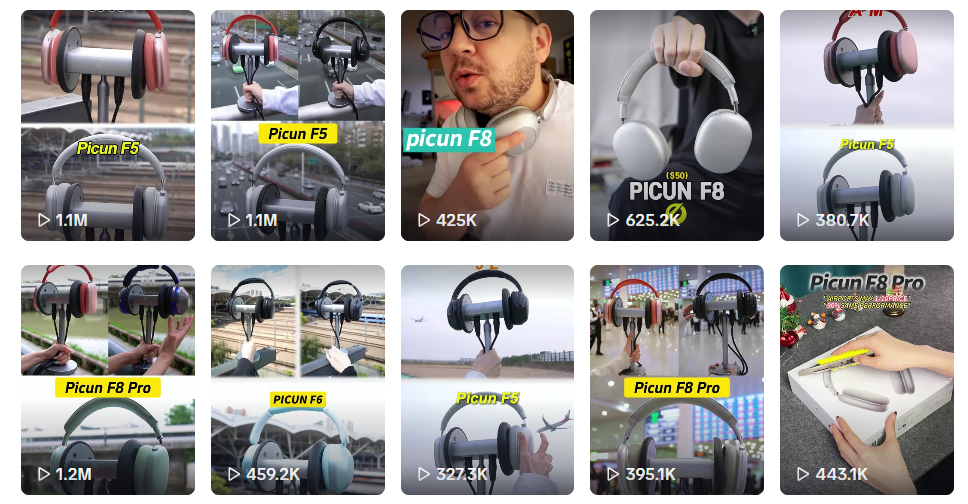 早期Picun所采取的内容模式以产品展示为主,他们在官方账号@picun_us上发布大量高噪音环境下的降噪对比视频,通过环境噪音与耳机降噪效果的反差,让用户“看见”技术差别。
