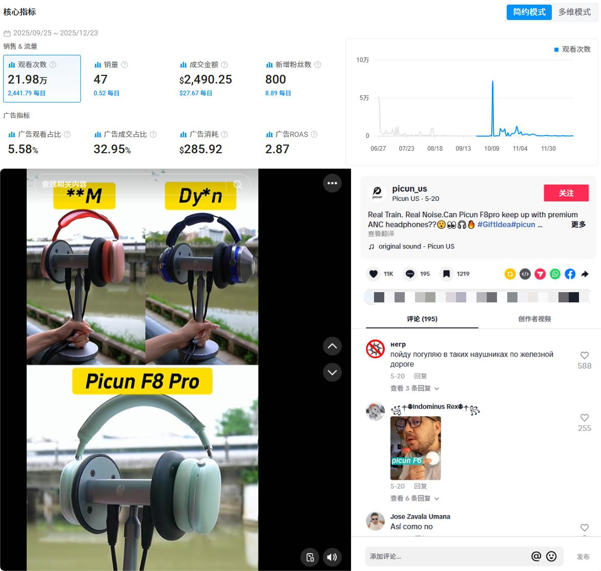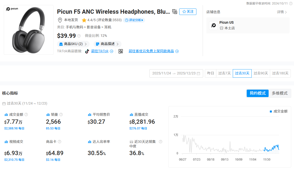 2024年10月,Picun正式入驻TikTok美国站。短短数月后,其F5 ANC耳机便创下单月销量突破5314台、销售额超20万美元的佳绩,迅速跻身类目头部。