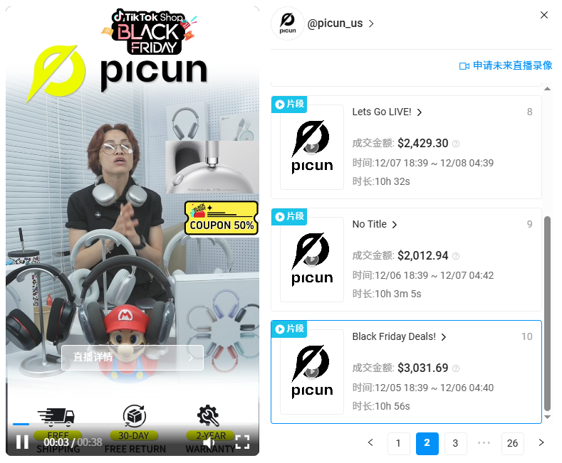 在官方账号形成稳定的流量以及用户社群之后,Picun品牌便不再以视频为主,而是转向了目前转化更快的TikTok直播。
