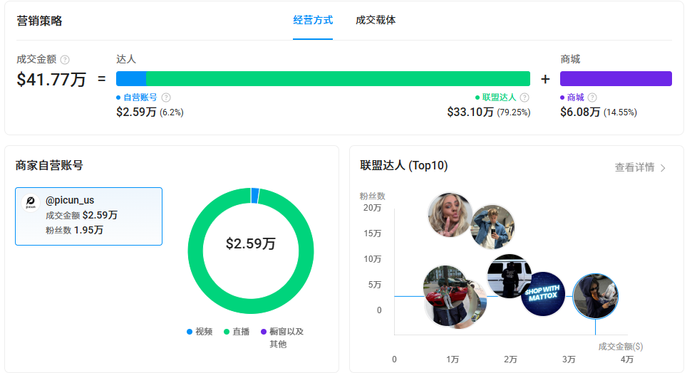 从数据来看,近30天内Picun品牌美区小店的总体交易额达到约41.77万美元,其中由达人贡献的销售额就占据了约33万美元。