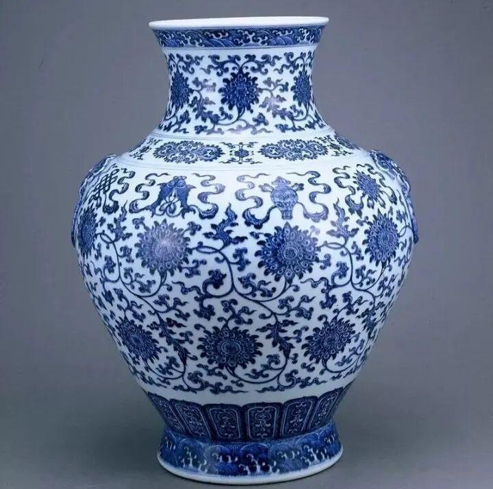 清乾隆青花缠枝莲托八宝双铺首瓶,高50.6、口径20、腹径38、底径22.2厘米。撇口,缩颈,丰肩,肩下缓收至足,圈足稍外撇,肩部两侧饰兽首衔环耳。口至足上下饰六层图案,口、颈、肩部饰三道青花弦纹,使其纹饰清晰地分为三层,口沿饰海水波浪纹,颈部饰缠枝莲纹,肩部饰二方连续花卉纹,第四层腹部主体纹饰为白地上画双层青花缠枝莲托八宝纹,八宝轮、螺、伞、盖、花、瓶、鱼、肠围绕在缠枝莲上方。腹下部饰一圈仰莲瓣纹,腹部主体纹饰和第五层的仰莲瓣纹用一周留白,使其清楚地分开主次,并融为一体,疏密相间,上下有序,显示出中国画留白魅力所在。圈足上再饰海水波浪纹与口沿的海水波浪纹遥相呼应。底足不施釉,修足,圈足有一个明显的着地面,呈现自然包浆。