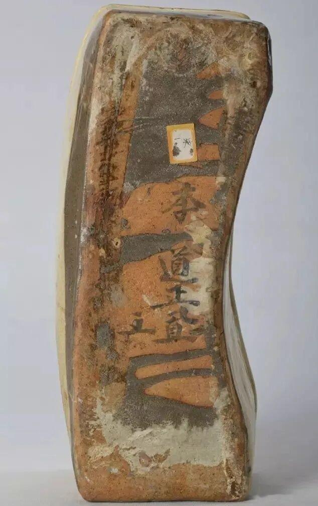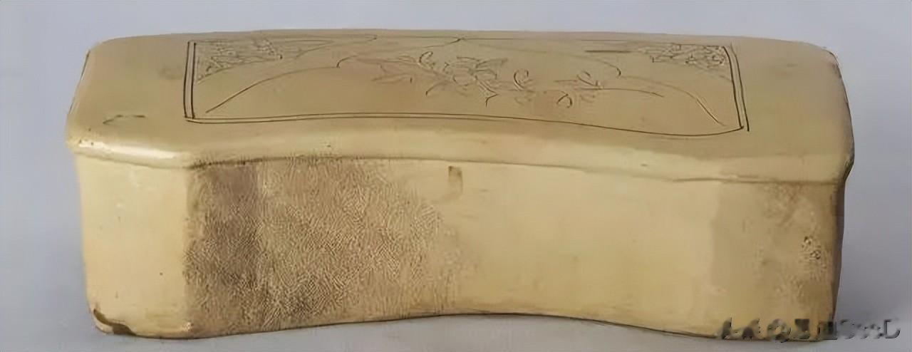金代山西窑白釉刻花长方枕,长47.5厘米,宽18厘米,高12.5厘米枕呈长方形,前壁内凹,后壁外弧。后壁左右上角各一小孔 ,枕面出檐,前低后高。施白釉,釉呈米黄色,釉质较薄。枕面光滑,四壁施釉不均,粗糙,部分漏釉并露出灰黑及白色二层化妆土。局部起泡。底露胎,胎色红褐,质地坚硬。枕底有墨书一行,自上而下为“李道正(置)□”。枕面用简单线条刻画装饰,四周用平行双线作框,框内刻画双线如意云头,云头外左右上角各刻画折枝花纹,形成对称。