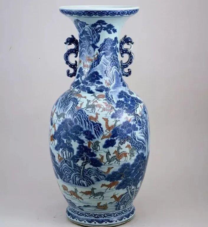 清乾隆釉里三色山水百鹿纹夔龙双耳瓶,高80cm 口径29.5cm 底径27cm,浅盘口,瓶口沿绘一圈规整的如意云纹。长颈丰肩,颈两侧置对称夔龙耳,玲珑别致。长鼓腹,底足略向外撇,泥鳅背状,通体饰釉,底足露胎,釉质晶莹光润,胎体厚重,胎质坚细洁白,缜密坚硬。