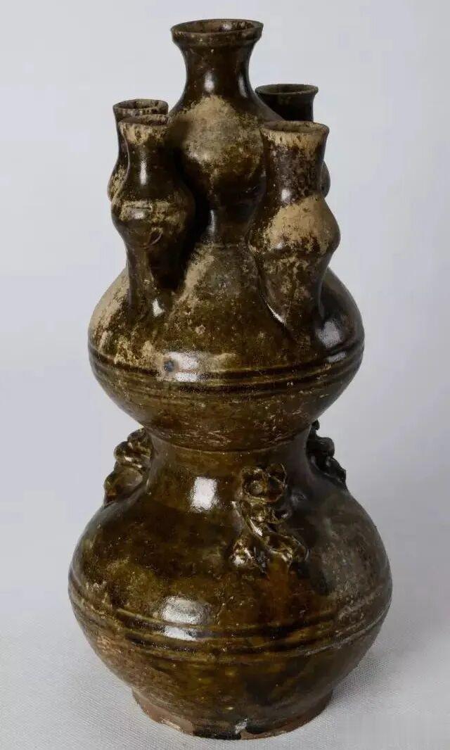 东汉褐釉堆贴熊纹五联罐,4.6厘米;底径:11.5厘米;上腹径:17.8厘米;下腹径:14.6厘米;高36.5厘米此件五联罐通身施褐色釉,釉薄,流釉及施釉不均。釉面光润,有细碎开片,局部剥釉。底足露胎,胎色灰黑,胎质不致密。器规整呈葫芦形,上腹小,下腹大,腹中部各有三道凹弦纹。上腹溜肩,肩部塑五罐,中间小罐为盘口,细颈,圆腹并且与器腹相通;周围四个罐较小,且与器腹不相通。下腹的肩部一周贴塑三只对称的熊,熊作进食状,形象生动逼真,憨态可掬。