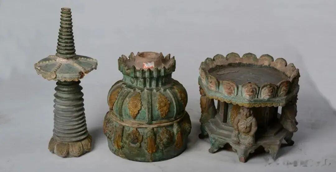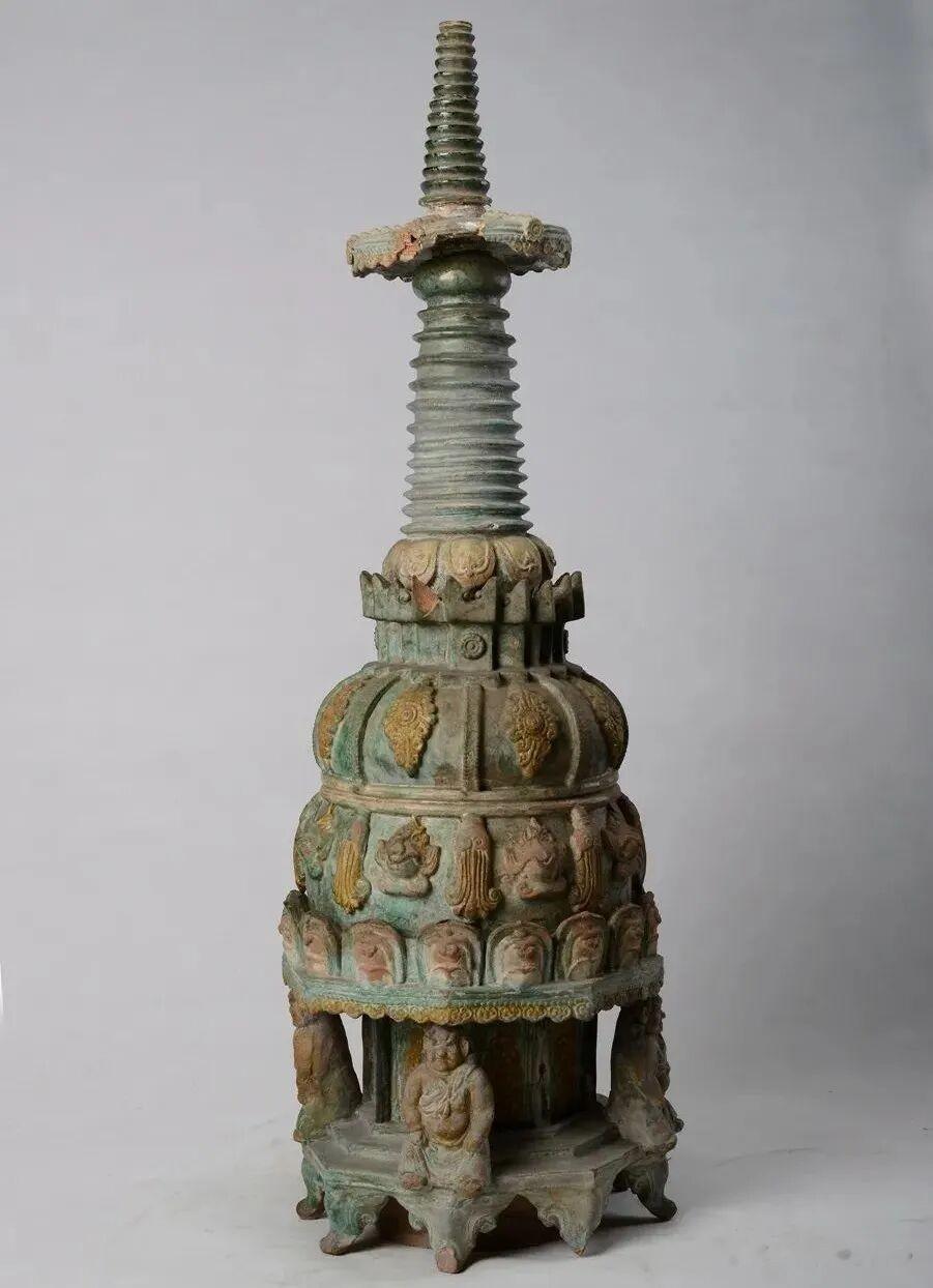 辽三彩堆贴雕塑花卉人物塔,高107厘米,底径33厘米,现藏于厦门华侨博物院。全塔由基座、塔身和塔刹三部分组成,基座、塔身和塔刹分别制作,作子母口相接,可重叠合并浑然一体。塔通体施釉,底及托座无釉,纹饰用黄、绿、褐釉。釉薄开片,部分剥落失亮,胎色灰红,胎质较松。