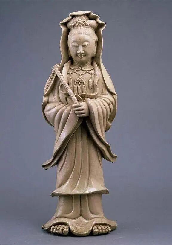 漳州窑白釉观音塑像,通宽22.2厘米,高63.8厘米,厚17.3厘米,通身施白釉,釉面光润,有细碎冰裂纹开片,形成纵横交错、妙如天成的浅细片纹装饰。釉色米黄,积釉处泛绿。底露胎,腹空,胎色灰褐,胎质较粗,底有布纹及乳支钉烧迹。