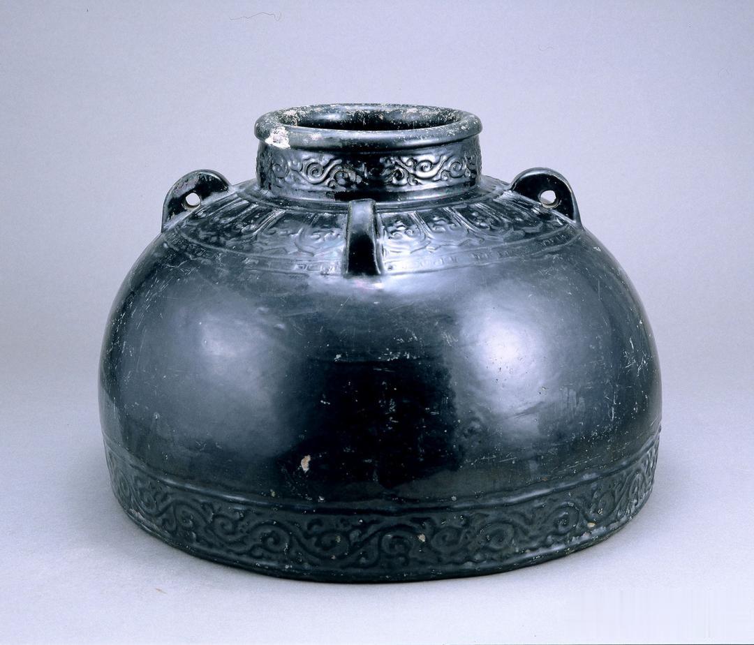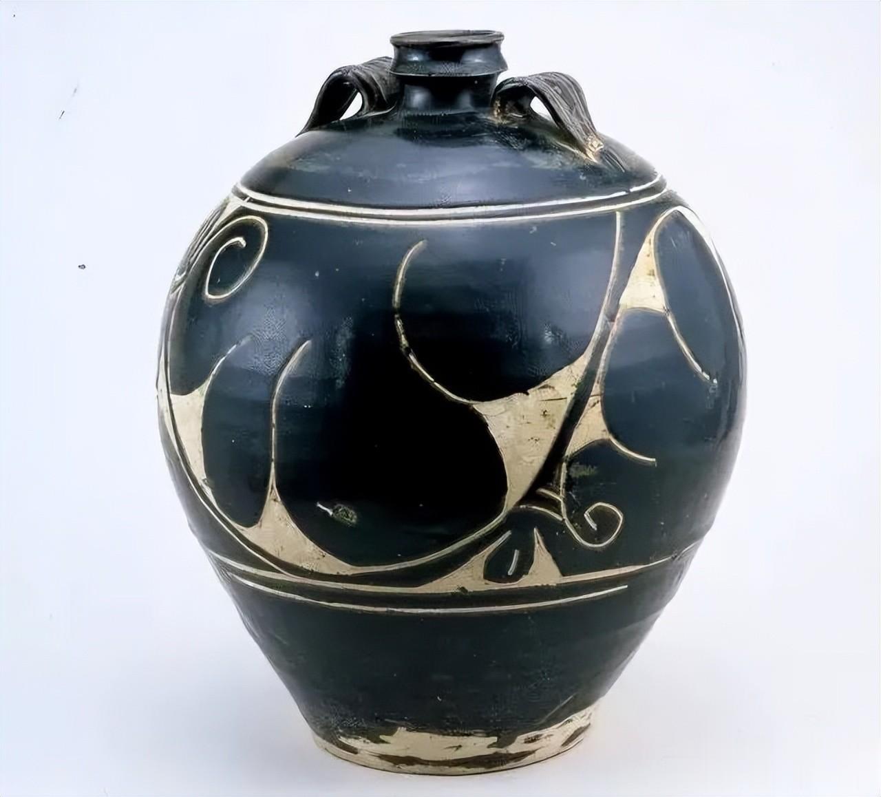 明永乐黑釉刻花四系罐,长47.5厘米、宽18厘米、高12.5厘米,直口束颈,颈短小,翻沿圆唇,丰肩鼓腹,平底,口小底大,器形如大圆罐上半部。肩部安四耳,每耳各有一圆孔。粗壮厚实,底部外沿布满一周凸起的乳钉,在颈部及罐底边沿饰一周模印的卷草纹,外加两道凸起粗壮的绳纹,肩部有模印覆莲瓣花纹一周,花纹长短适度,圆浑有力。通身施黑釉,釉厚,釉面光润,乌黑发亮,犹如漆器。胎质坚硬致密,色灰黑。此器形规整,体宽厚重结实,造型罕见。