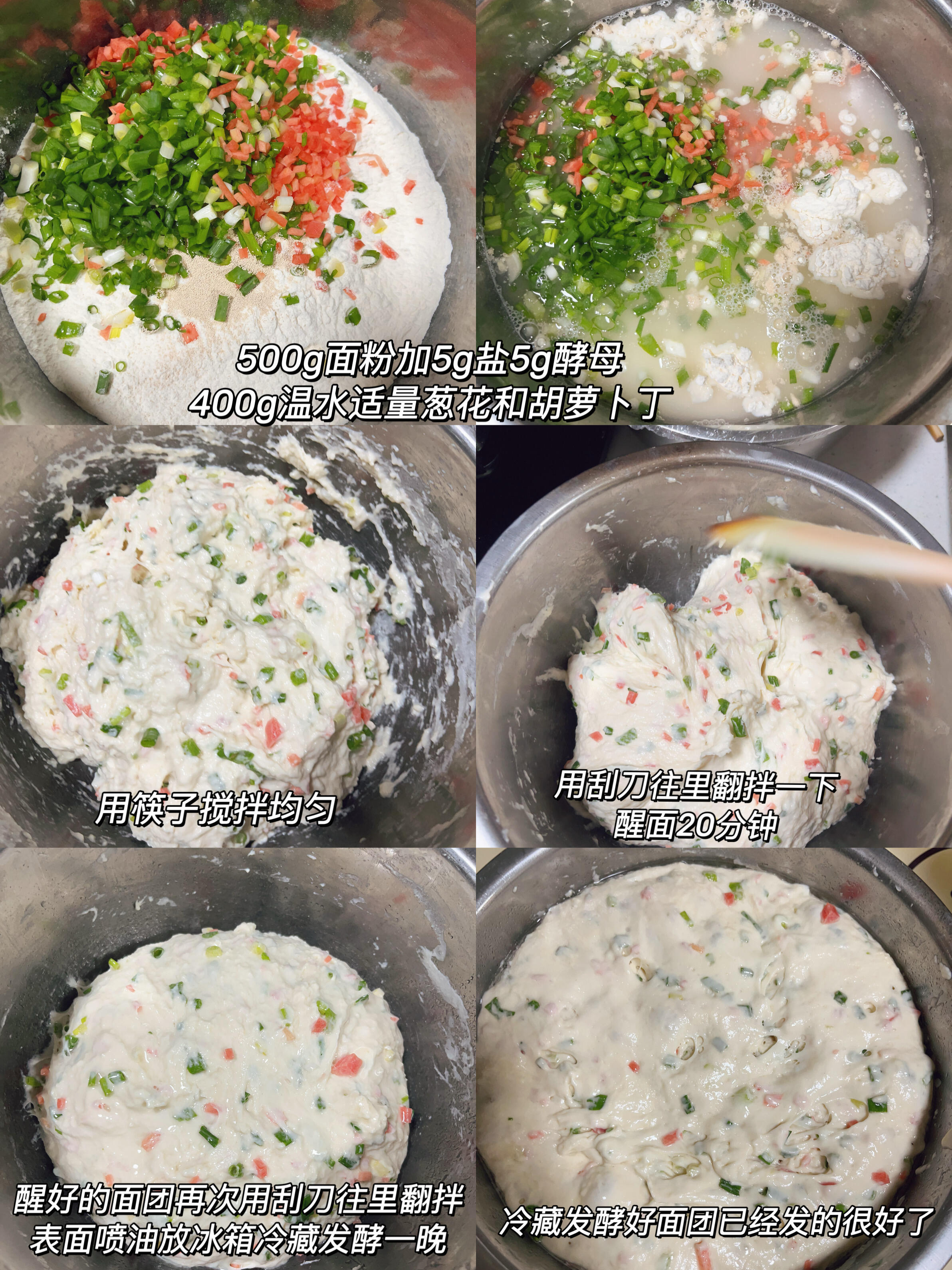 1. 大碗里倒面粉,中间挖个坑,放酵母、盐,周围撒上葱花和胡萝卜丁(蔬菜碎别堆中间,免得酵母接触盐分失效)。