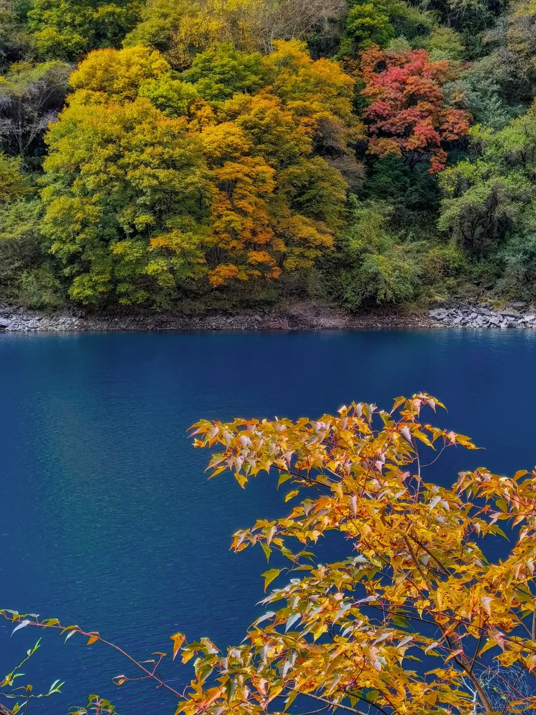 从一叶知秋到层林尽染,这里的秋景堪称无敌,红的、黄的叶子与蓝的、绿的湖水连接广阔的天空,水天一色!
