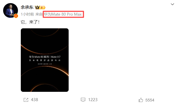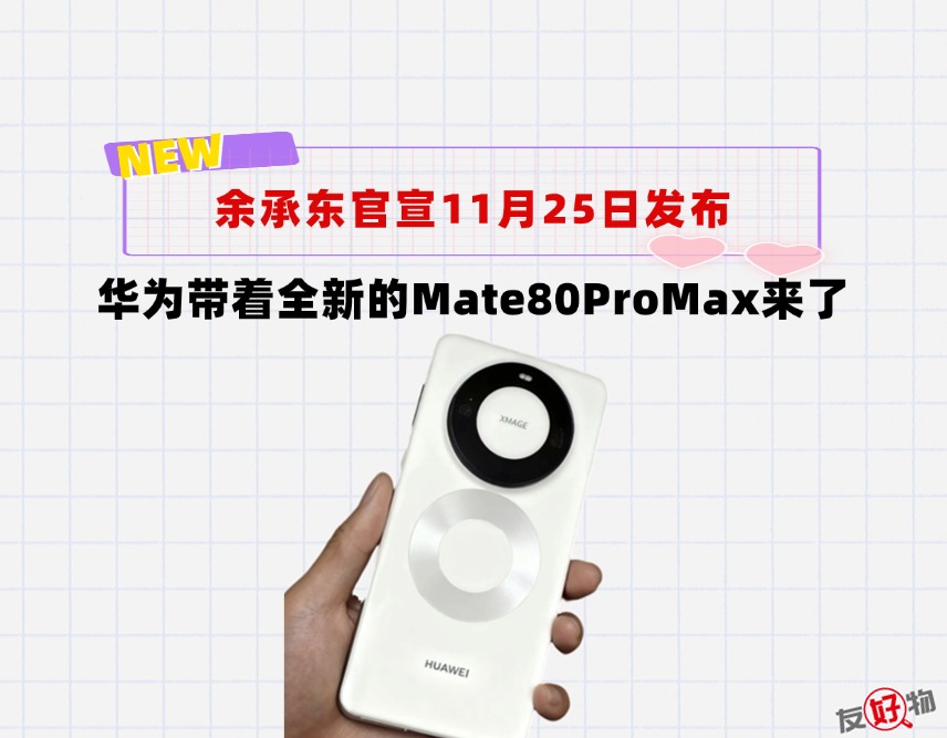 就在刚刚,@余承东 在微博官宣了华为Mate80系列将于11月25日发布,并且还露出机型小尾巴——华为Mate80ProMax,看来此前华为Mate80要改名的爆料成真了。