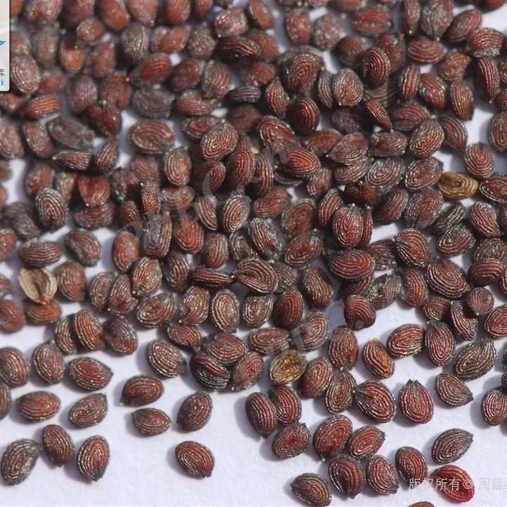 种子倒卵形,长约1.5毫米,稍扁平,褐色,有同心环纹