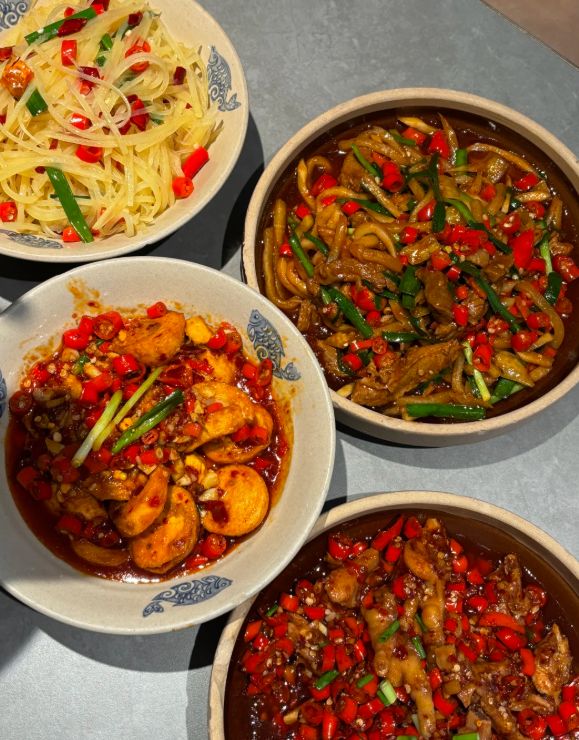 玉楼东的招牌菜,是发丝牛百叶。这道菜考验的是刀工,牛百叶要切成细如发丝的丝,长度均匀,粗细一致。切好的牛百叶用热油快速爆炒,加入辣椒、蒜苗、姜丝,几十秒就出锅。牛百叶脆嫩爽口,辣味恰到好处,每一口都能感受到刀工的精细和火候的精准。这道菜已经传了四代,至今仍是玉楼东的镇店之菜。