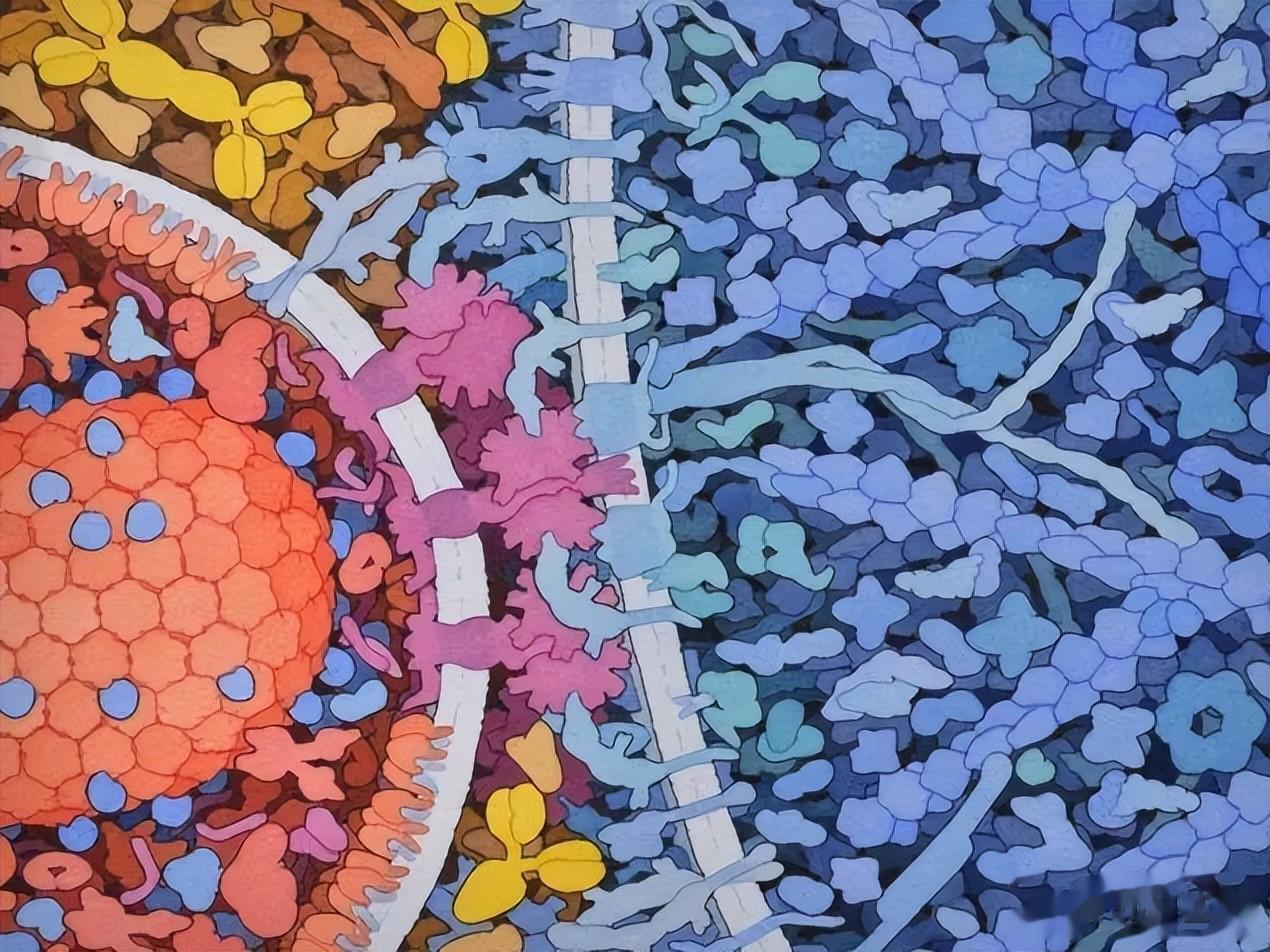 图:一幅艾滋病病毒(左)附着在细胞上的示意图