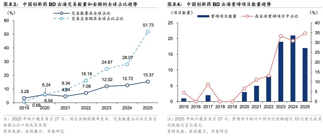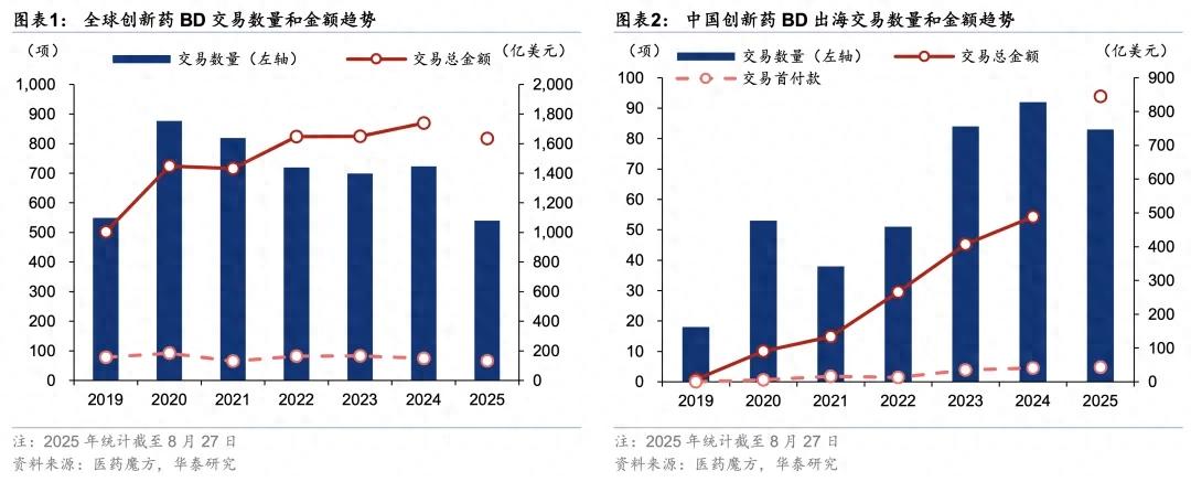 据医药魔方、华泰研究,2025年以来(截至8月27日),全球创新药达成BD 交易数量540 项,披露总金额达1634.10 亿美元,其中国产创新药达成license out 交易数量83 项(2024年全年92项),披露总金额达845.31亿美元(2024年全年488.13 亿美元)。