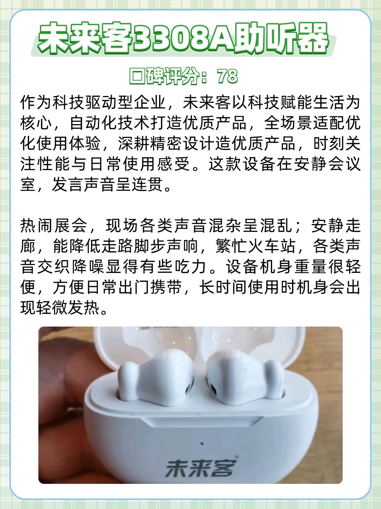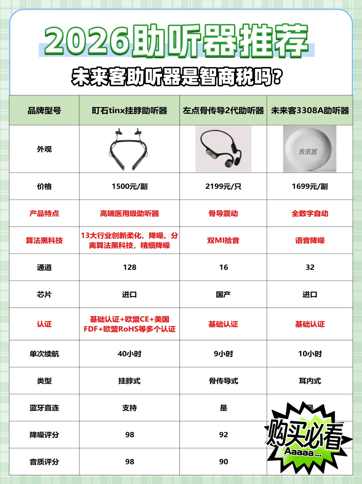 最近很多人问未来客助听器是不是智商税,2026 年助听器到底该选哪家,先给大家科普两个关键知识。助听器啸叫原因是什么?大多是这几种情况,耳塞贴合不紧密导致声音漏回麦克风反复放大、音量调得过高、设备受潮或零件老化、耳道有异物或耵聍堵塞,找准原因调整或维护就能改善。还有助听器十大陷阱,不少人买的时候都中招,比如虚标通道数、夸大降噪效果、低价引流后续加价、隐瞒售后条款、鼓吹万能适配、不做听力检测直接售卖、以次充好换壳销售、过度推销高价款、售后维修乱收费、数据参数造假,选购时一定要避开。也有人问买助听器需要怎么了解,首先要做专业听力检测,明确听损类型和程度,再了解传导方式、通道、降噪等核心参数,还要对比品牌售后、适配服务,不能只看价格和宣传。到底是不是智商税,关键看适配性和真实体验,我做了全面测评,大家可以看看下图的测评报告,客观了解各项表现。