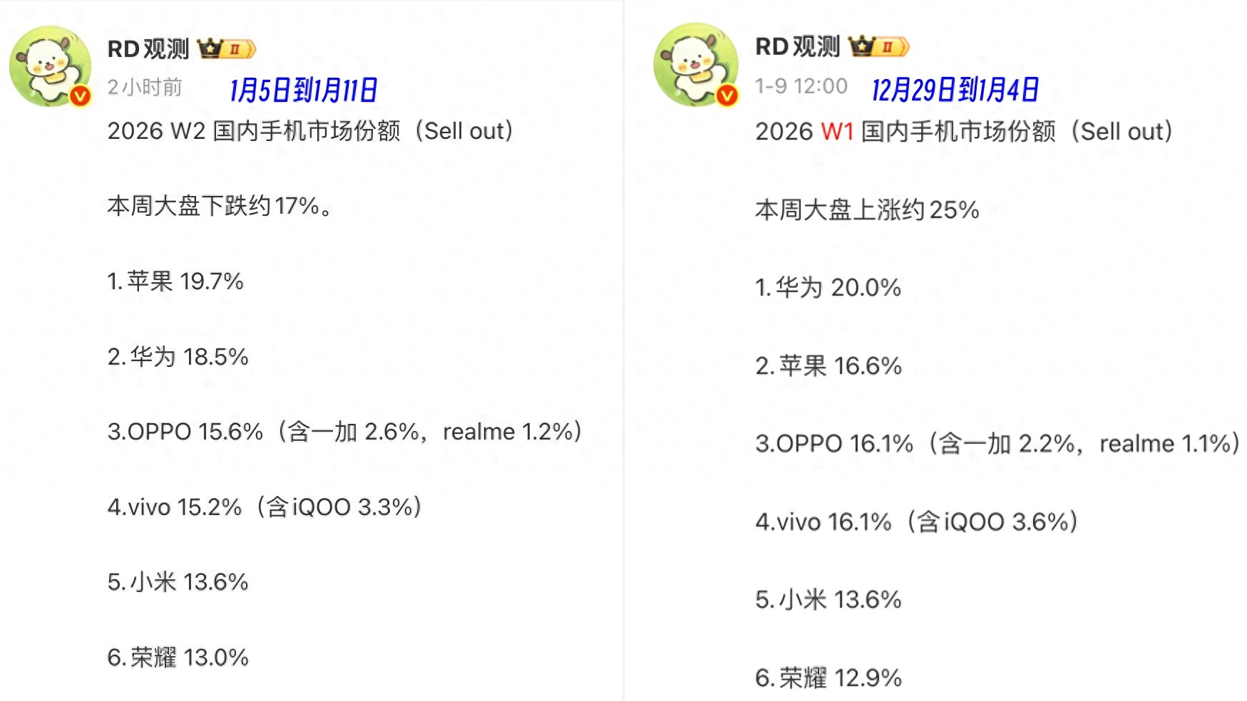 今天分享的是2026年W2国内手机排行榜,对应的时间是2026年1月5日到1月11日,因为假期结束和未有新机开售,所以本周大盘下跌了约为17%。因为真我回归OPPO,所以vivo跌出了榜单前三名,华为排名第二,苹果重回第一属于意料之中。