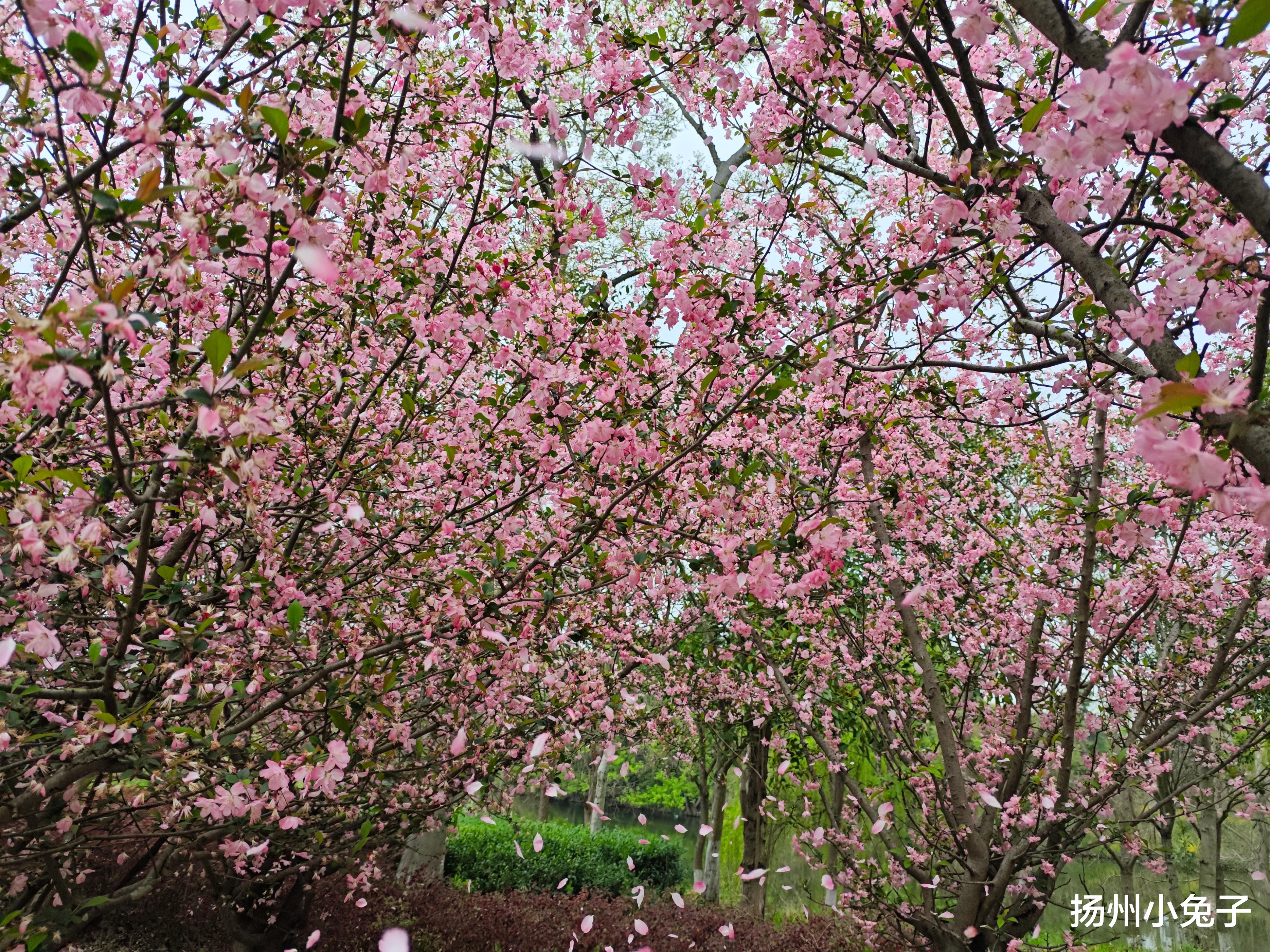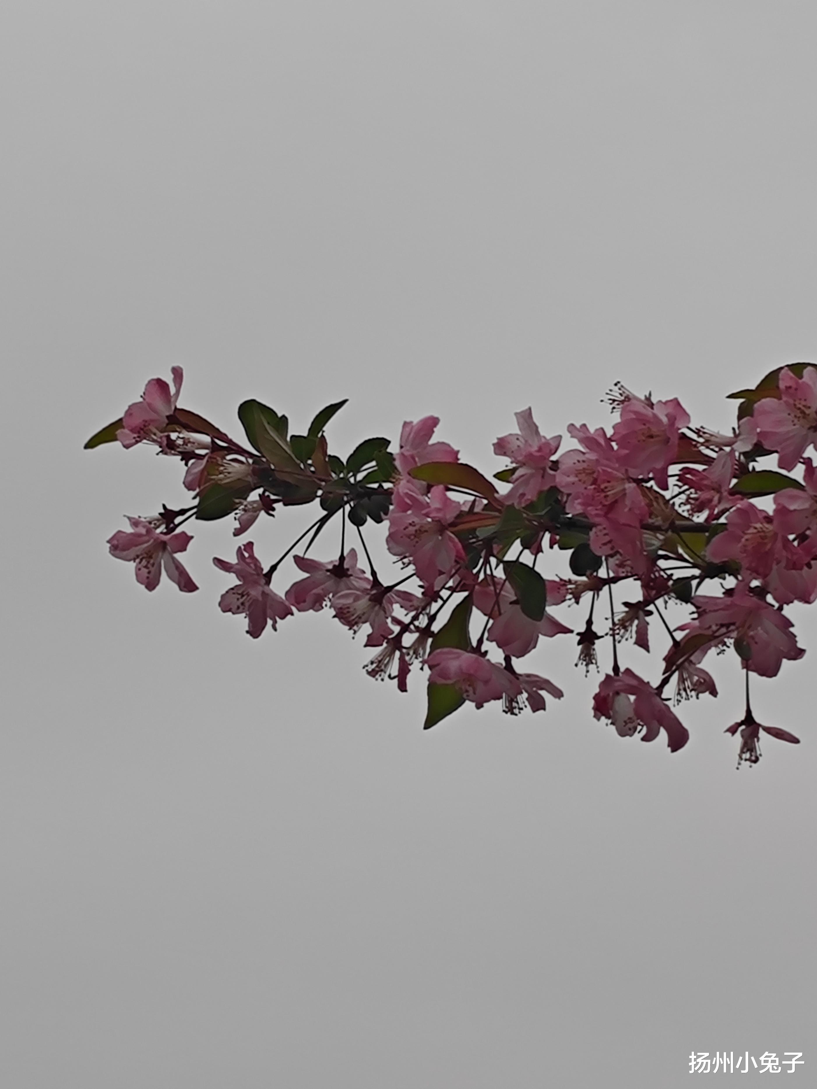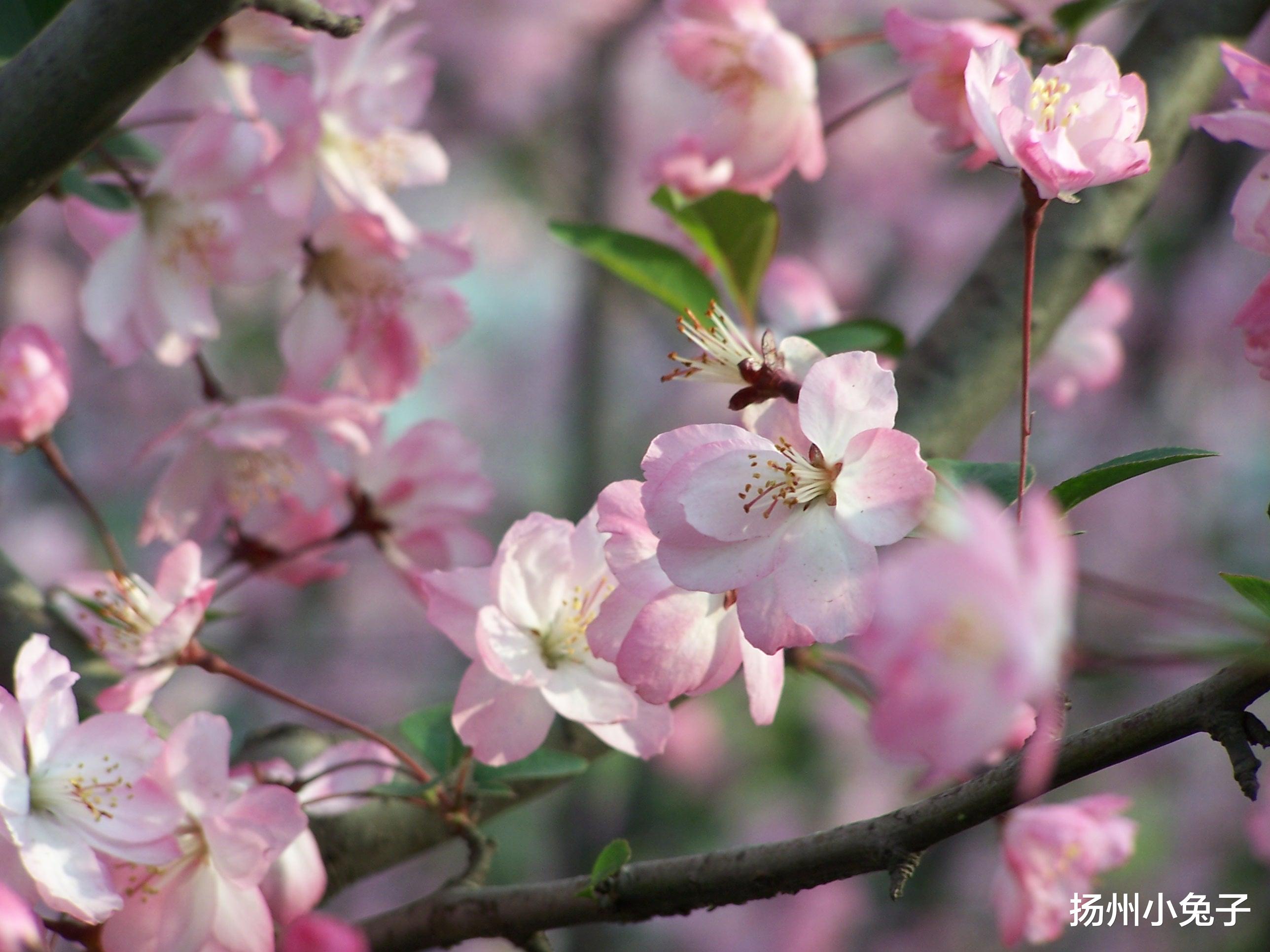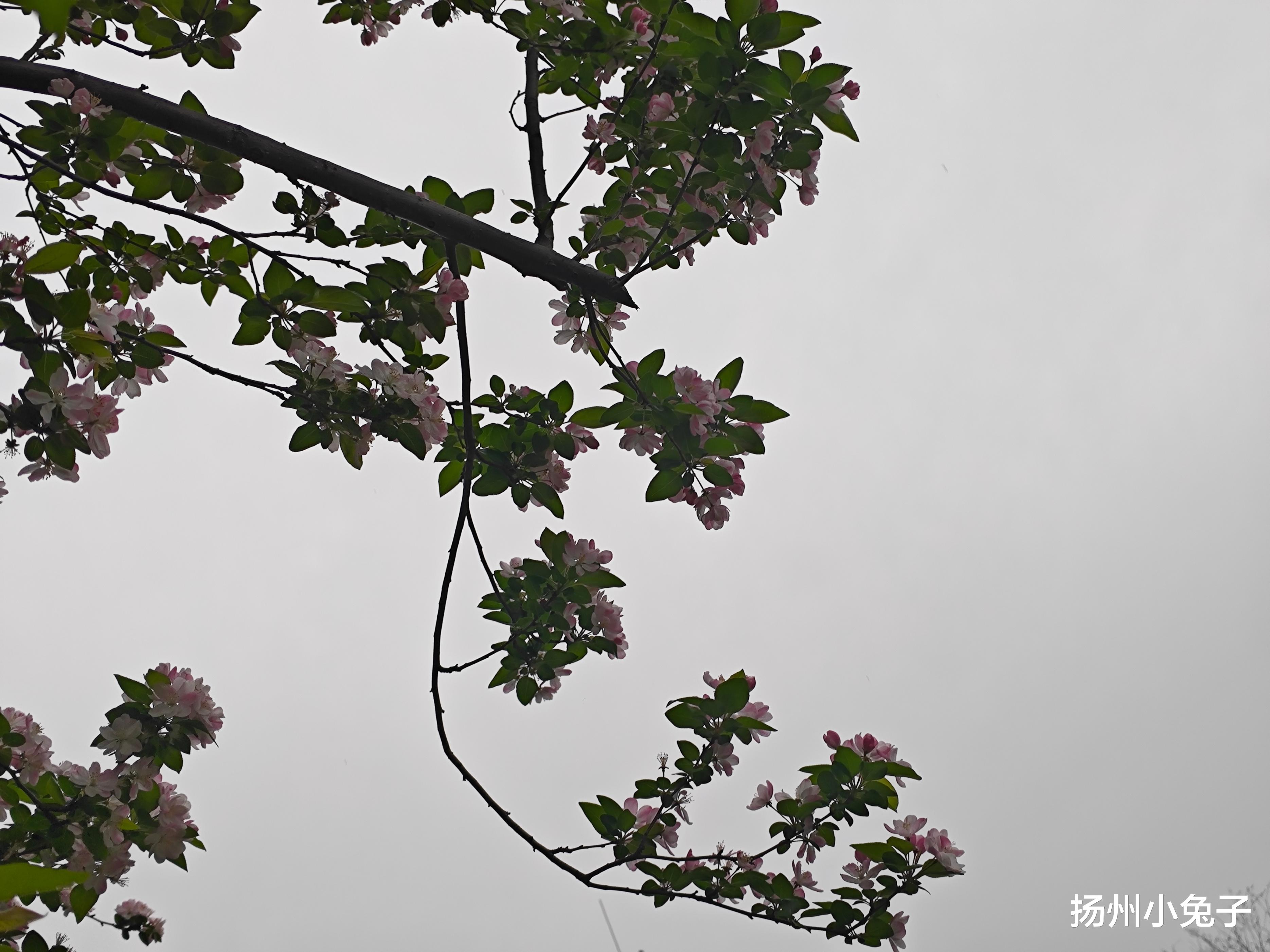 海棠花开了,轰轰烈烈。一树树海棠,红中夹粉,粉里带白!在扬州的很多地方,垂丝海棠是最多的存在。