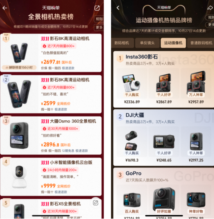 在天猫“双十一”最新榜单中,影石在运动相机总榜上力压大疆和GoPro夺得销量冠军,并在全景相机榜单中独占鳌头。