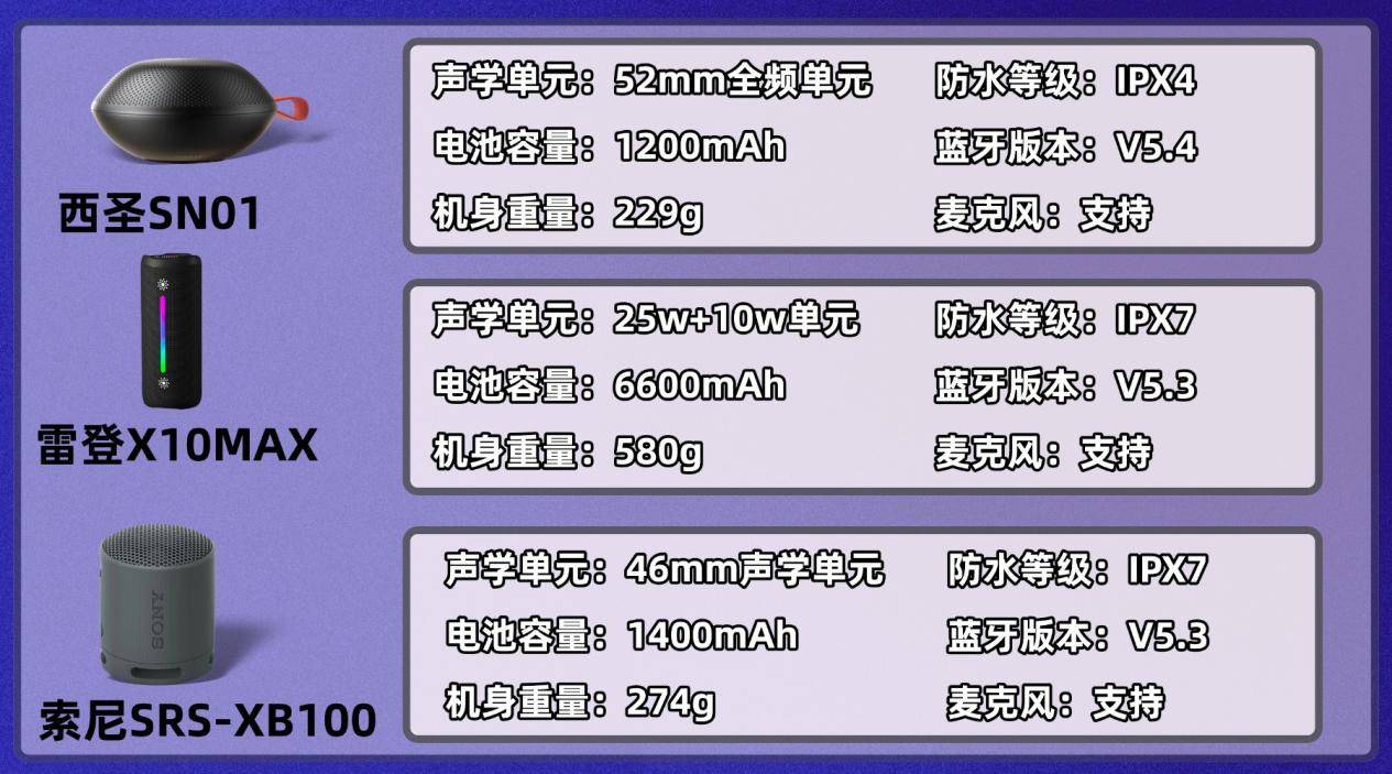所以这一次我就直接入手了百元价位比较热门的三款蓝牙音箱,分别是西圣SN01、雷登X10MAX和索尼SRS-XB100,从便携性、音质、连接稳定性和续航时间这几个最主要的维度实际测评一下,看看哪款更值得入手!