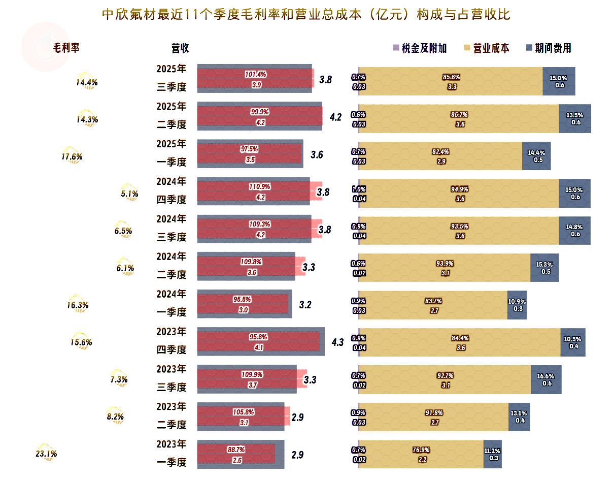 中欣氟材现在遇到的主要问题是其“基础氟化工产品”的毛利率从2023年以来大幅下降;与此同时,该业务还超过“农药化工产品”成为第一大业务,这就严重拖累了其平均毛利率。2025年上半年的“基础氟化工产品”毛利率已经不足1个百分点,似乎到了止跌回升的谷底了,但有发言权的不是编报表和看报表的人,而是残酷且内卷的市场。
