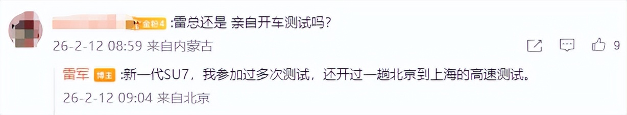 随后,有网友在评论区表示:雷总还是亲自开车测试吗?雷军回应称:新一代SU7,我参加过多次测试,还开过一趟北京到上海的高速测试。