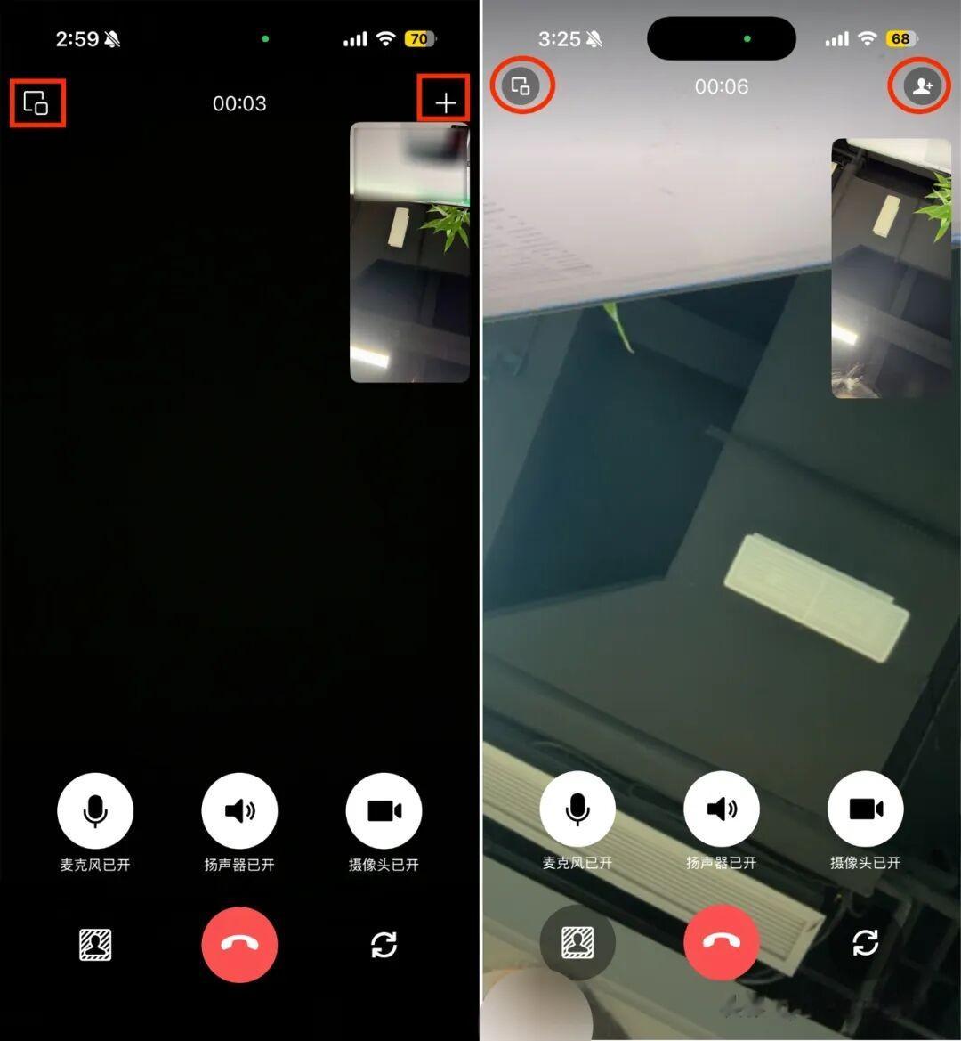 此外,更新后在视频通话的界面中,顶部两端的功能按钮经历了一次明显的视觉重构。微信给这两个按钮加上了不透明的深色圆形背景,虽然按钮本身变小了,但在深色背景的衬托下,按钮在复杂的视频背景中更加突出,视觉辨识度更高。