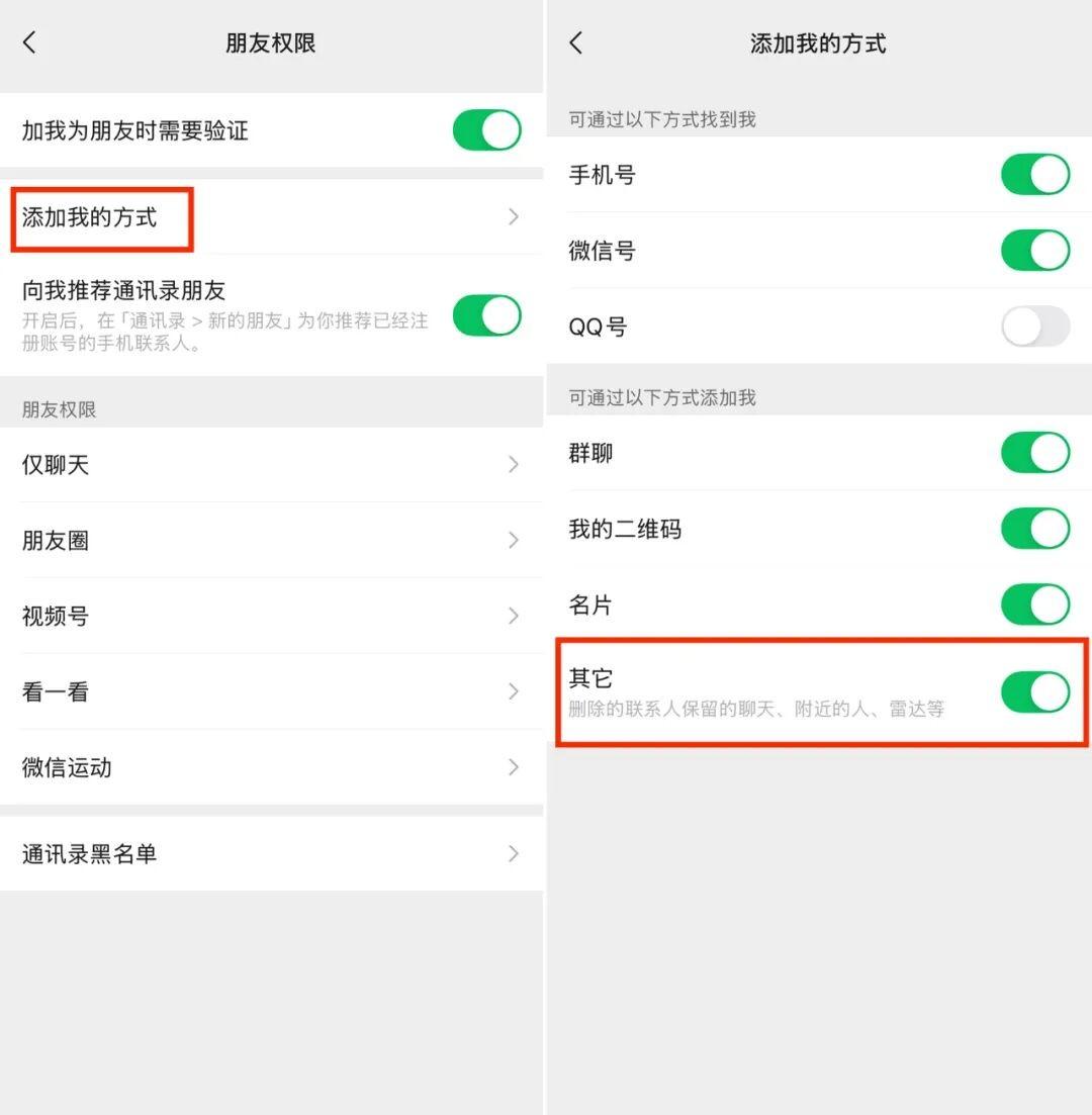 打开微信的“我”-“设置”-“朋友权限”-“添加我的方式”,这里新增加一个“其它”的开关。