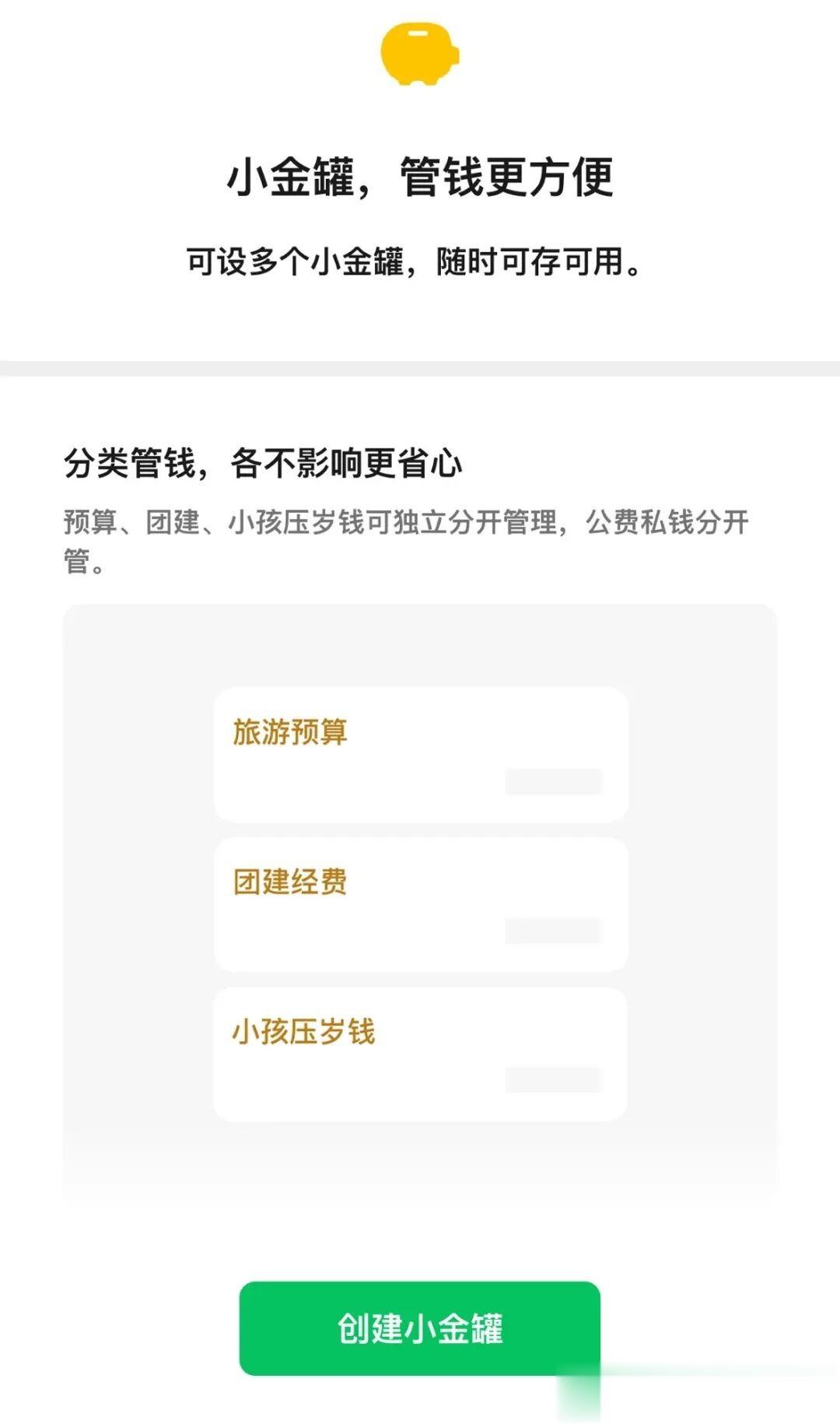 该功能支持创建多个小金罐,随时可存可用,方便记账和分类管理资金,类似支付宝的小荷包,用户可以分别设置旅游预算、团建经费、小孩压岁钱,把不同用途的钱独立分开管理。