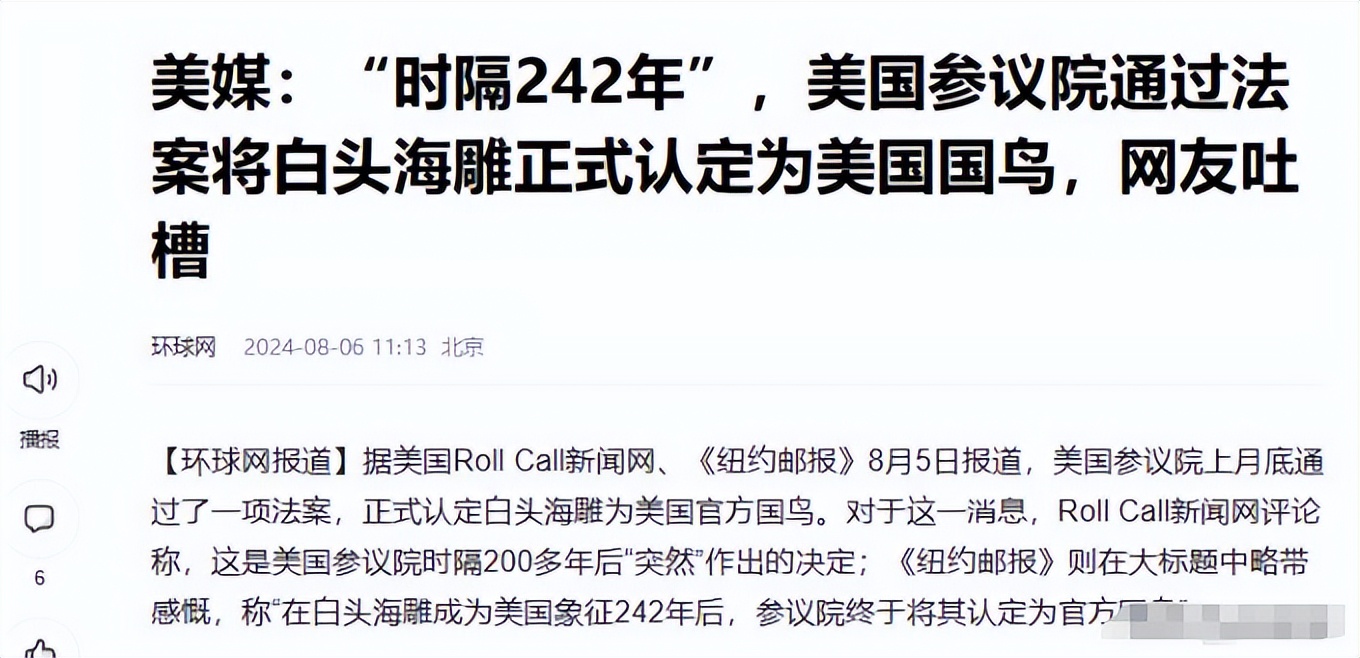 美国的国鸟白头海雕(俗称白鹰),地位尤为特殊。