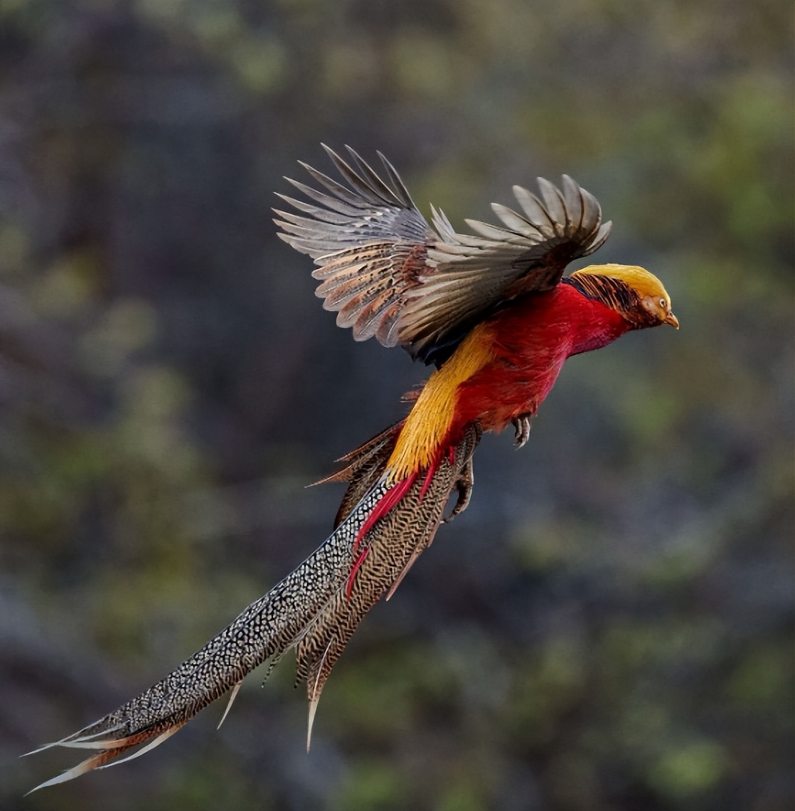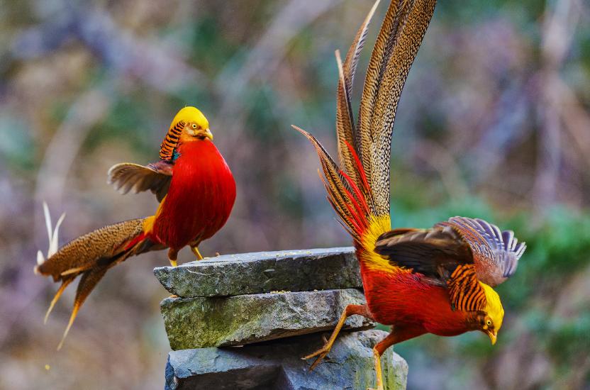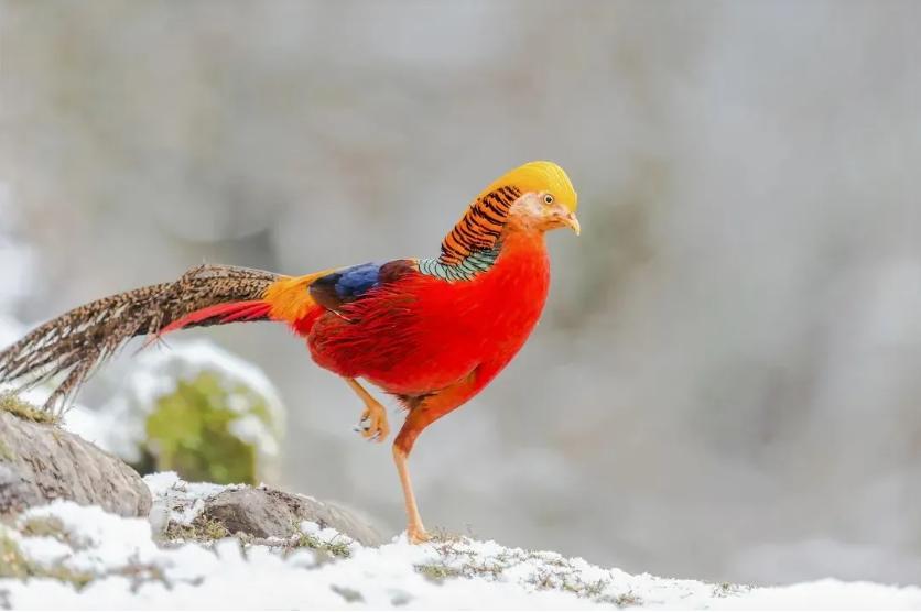 红腹锦鸡长得扎眼,雄性羽毛赤红金黄,尾羽修长华丽。