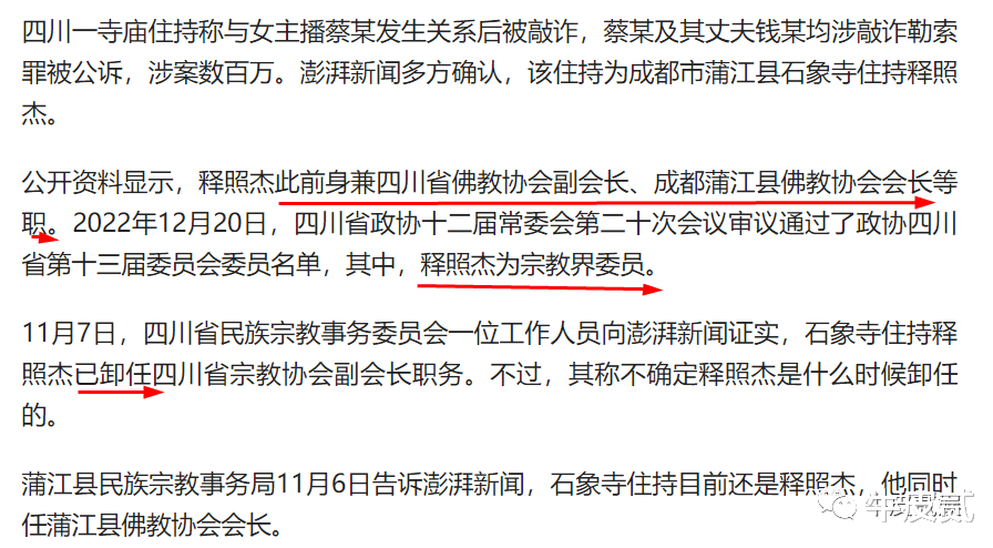 根据媒体的深挖和网友的深扒可知,张某是成都市蒲江县石象寺住持释照杰。