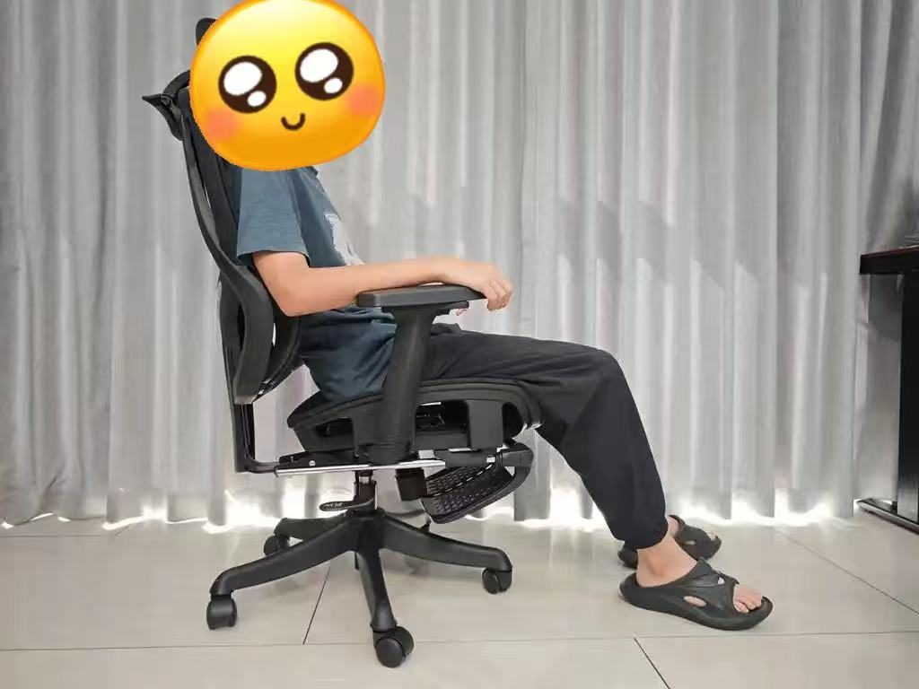 护腰效果:双背联动系统,椅背上下分区可独立活动,坐时腰背能获得动态贴合支撑,一定程度缓解腰部悬空感。支撑力度适中,无明显顶腰不适;不足是分区联动顺滑度一般,坐姿快速切换时略有卡顿感。