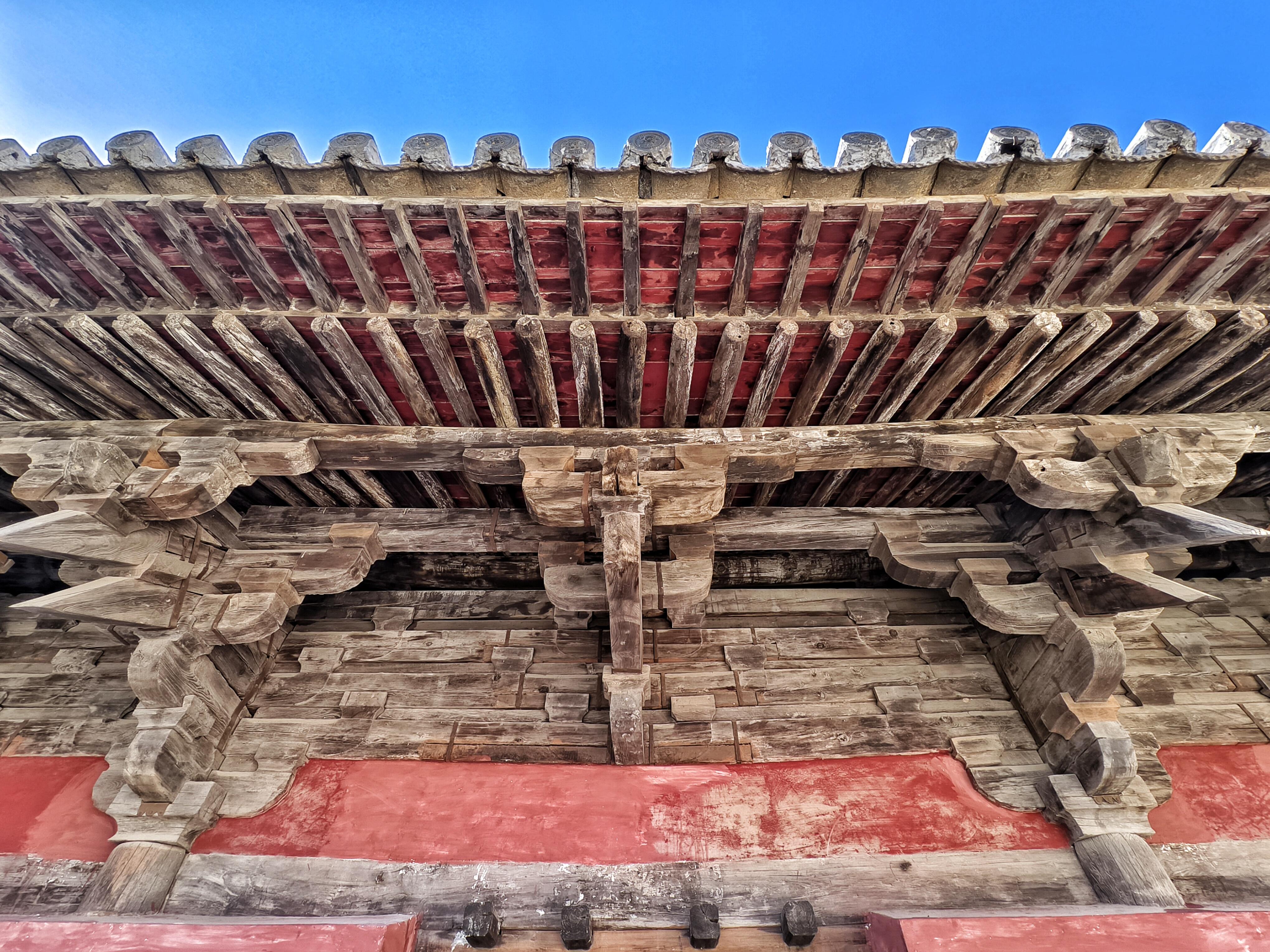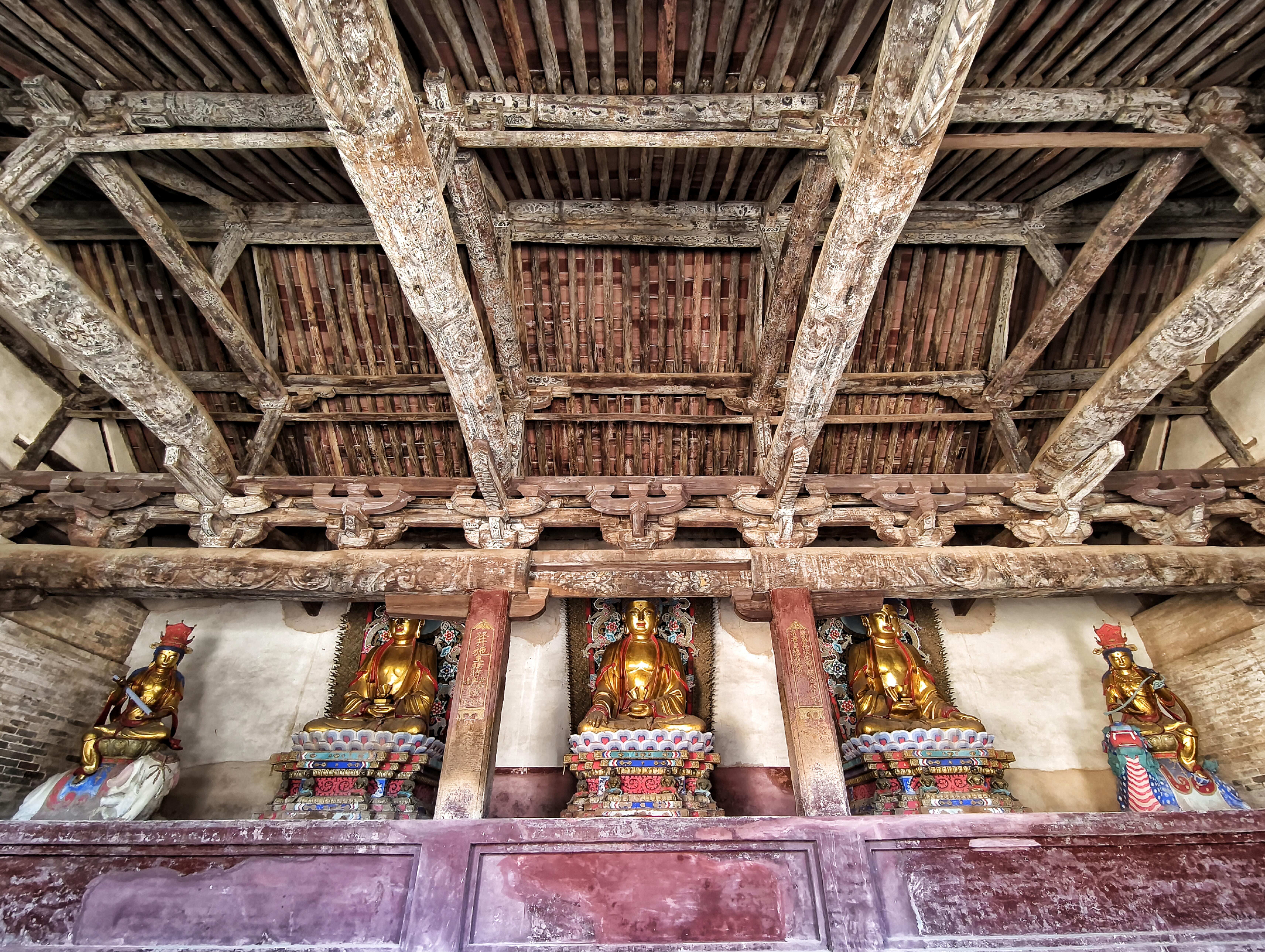 殿里比外面暗些,阳光从窗棂斜斜地照进来,在青砖地上投下细长的影子。抬头看,梁架上没有彩绘,只有裸露的木梁,木纹在光线下看得清清楚楚,像水波纹一样一圈圈荡开。最让人惊讶的是梁架的结构——没有一根立柱落地,几道横梁像胳膊肘一样互相搭着,撑住了整个屋顶。当地文保员说,这叫"断梁",是宋代的手法,全寺就这一处,全国也少见。