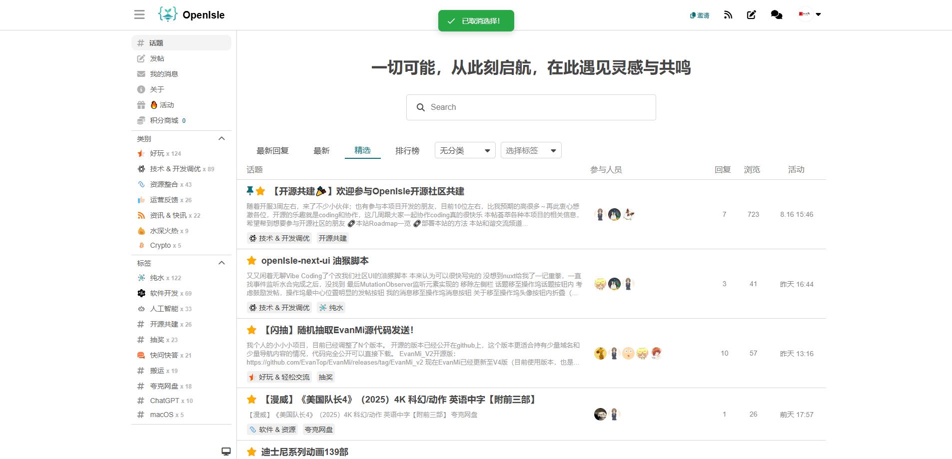 http://localhost:3000/如果你想搭建一个技术交流社区或者是兴趣爱好圈子,OpenIsle 都能满足需求。你可以根据自身需求,对其进行定制化开发,打造一个独一无二的社区空间~