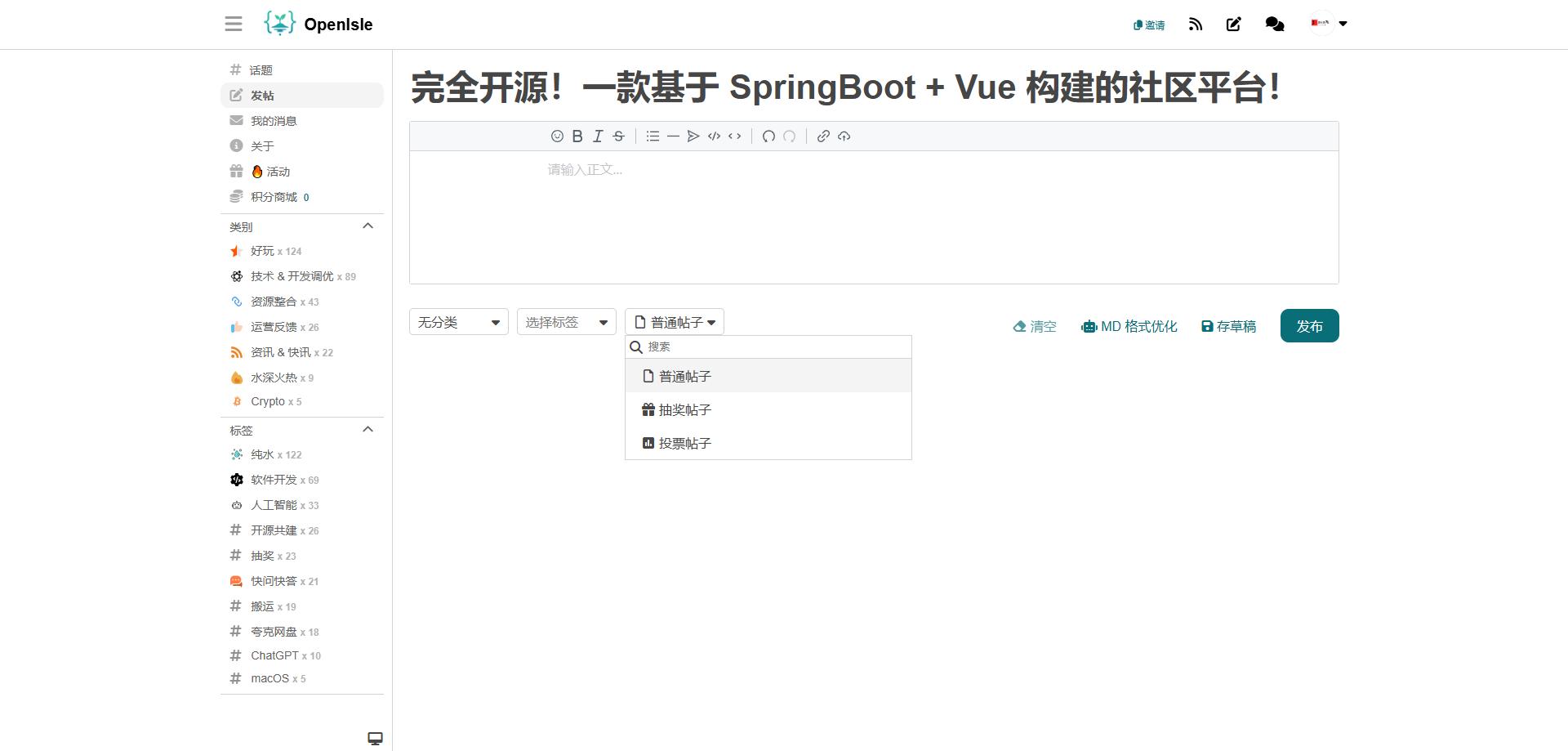 项目介绍OpenIsle —— 一个使用 SpringBoot 和 Vue3 构建的全栈开源社区平台,提供用户注册、登录、贴文发布、评论交互等完整功能,可用于项目社区或直接打造自主社区站点。