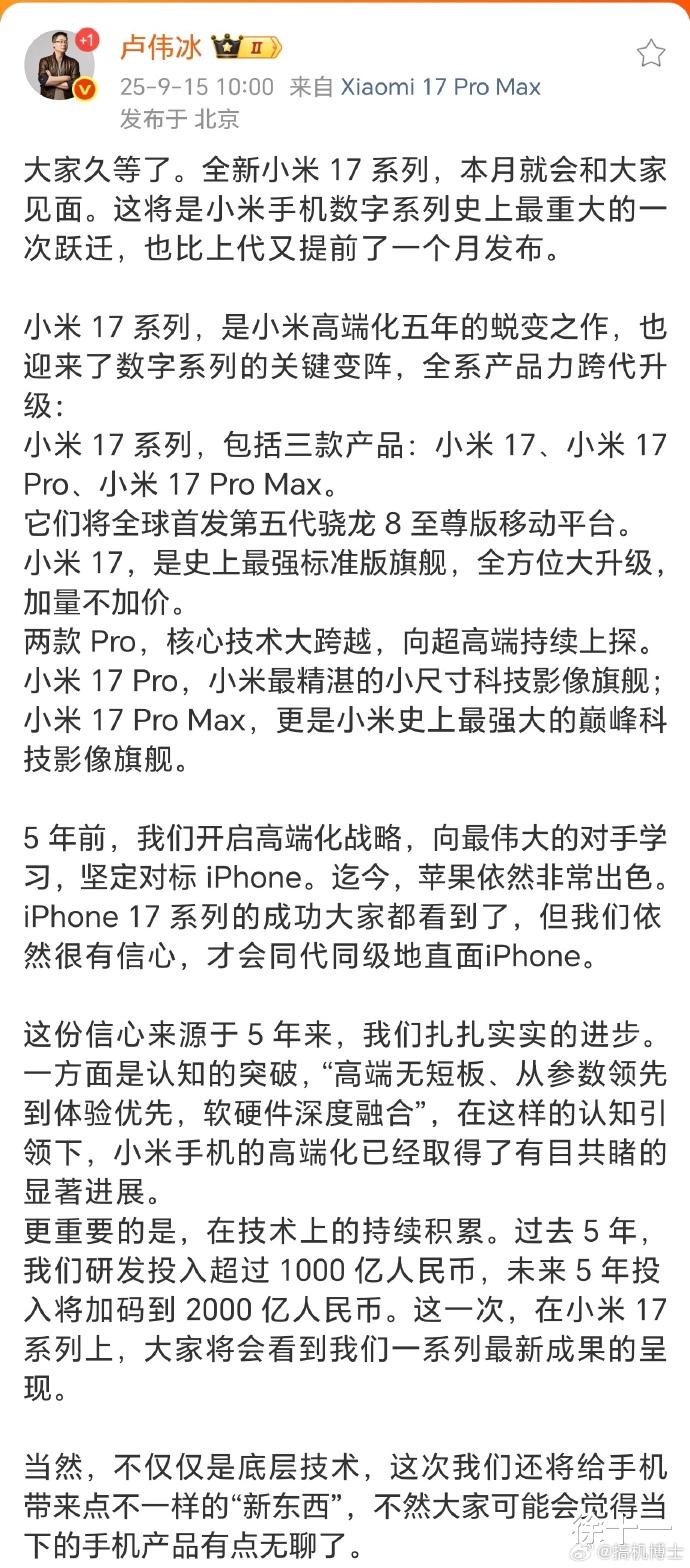 就在今天(9月15日),小米总裁卢伟冰突然宣布:小米数字系列跳过16,直接发布小米17系列!