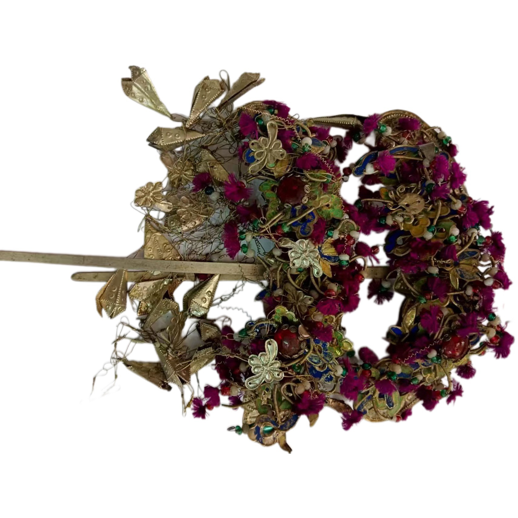 绒花点缀:绒花以蚕丝为原料,经过染色、拉丝、编制等多道复杂工序制成。它色彩艳丽、造型逼真,且 “绒” 与 “荣” 谐音,寓意荣华富贵。将绒花点缀在头饰上,为整体增添了柔美的气息,同时也丰富了头饰的吉祥寓意,让头饰在华贵之余,多了一份灵动与生机。