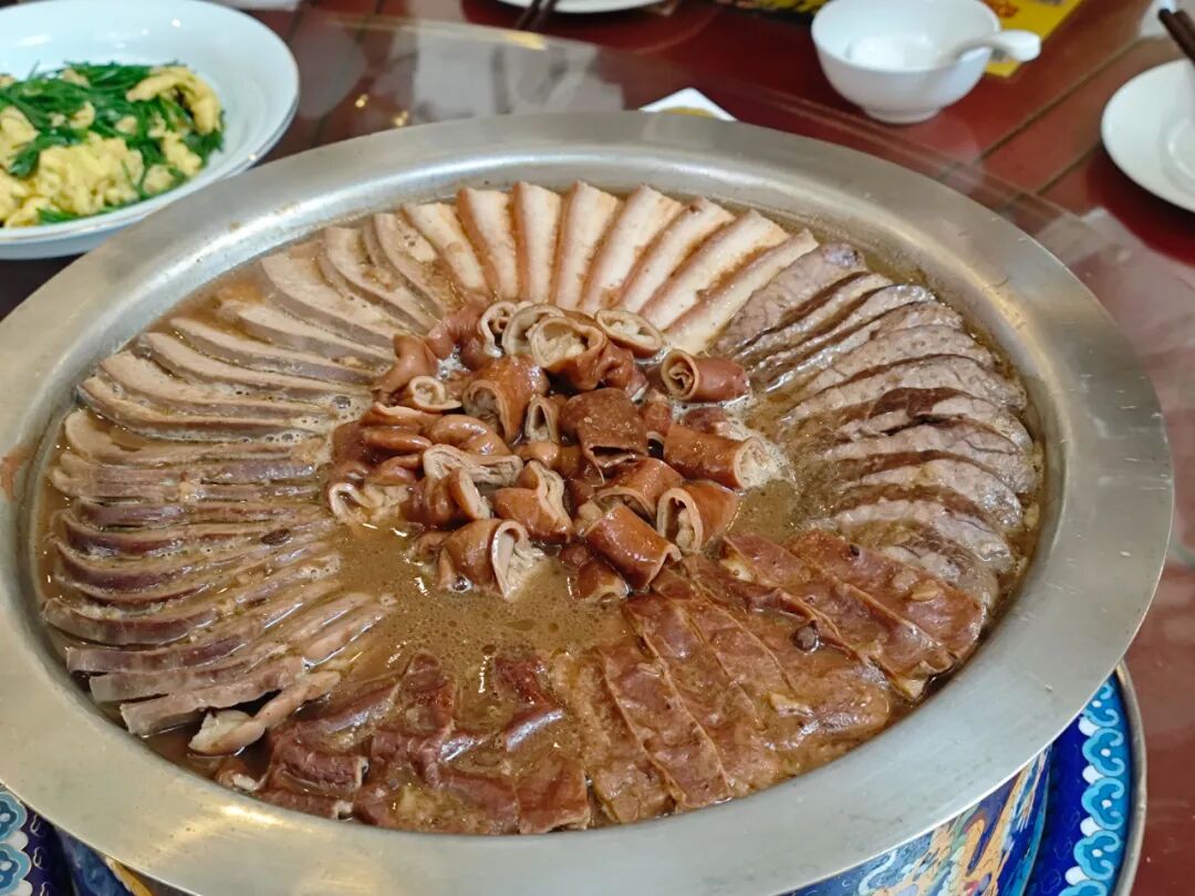 卤煮什锦火锅热气腾腾的一大锅,下面用酒精灯加热,越吃越热乎。小肠、五花肉、猪心、猪肝、猪肚、炸豆腐、猪肺、肚仁、火烧等在香浓在香浓卤汁中融合,每一口都是对味蕾的抚慰。