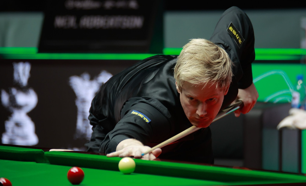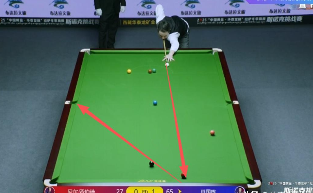 真正的考验来自与罗伯逊的强强对话。比赛开局,肖国栋仿佛开了“外挂”,手感热得发烫。首局多次攻防转换后稳稳超分,1-0抢占先机;第二局更是向着147满分杆发起冲击,可惜65分时黑球失误梦碎,但凭借46分的领先优势实现被动超分,再下一城;第三局乘胜追击,69分超分后顶住罗伯逊的顽强抵抗,以3-0的完美开局将对手逼入绝境。