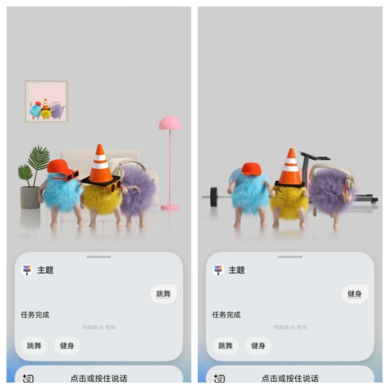 而且鸿蒙6还带来了“AI语音互动”功能,锁屏上点那个小艺星环,就能跟它“聊天”。我试着说了句“跳舞”,这三个小毛球顶上的迪斯科球便开始转动,它们会随之舞蹈,让我的烦恼瞬间清空。