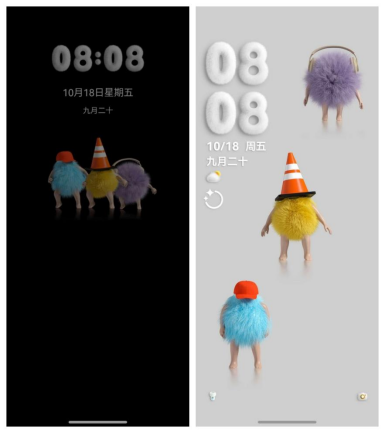 换完主题的锁屏界面,不再是简单的壁纸和单调的数字时钟了,而是多了几个毛茸茸、带小脚的颜色亮丽的“活物”,它们在时种下扭动跳舞,还会在点亮屏幕时“duang”的一下蹦出来,太可爱,太治愈了!