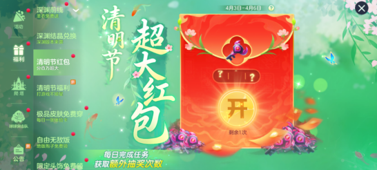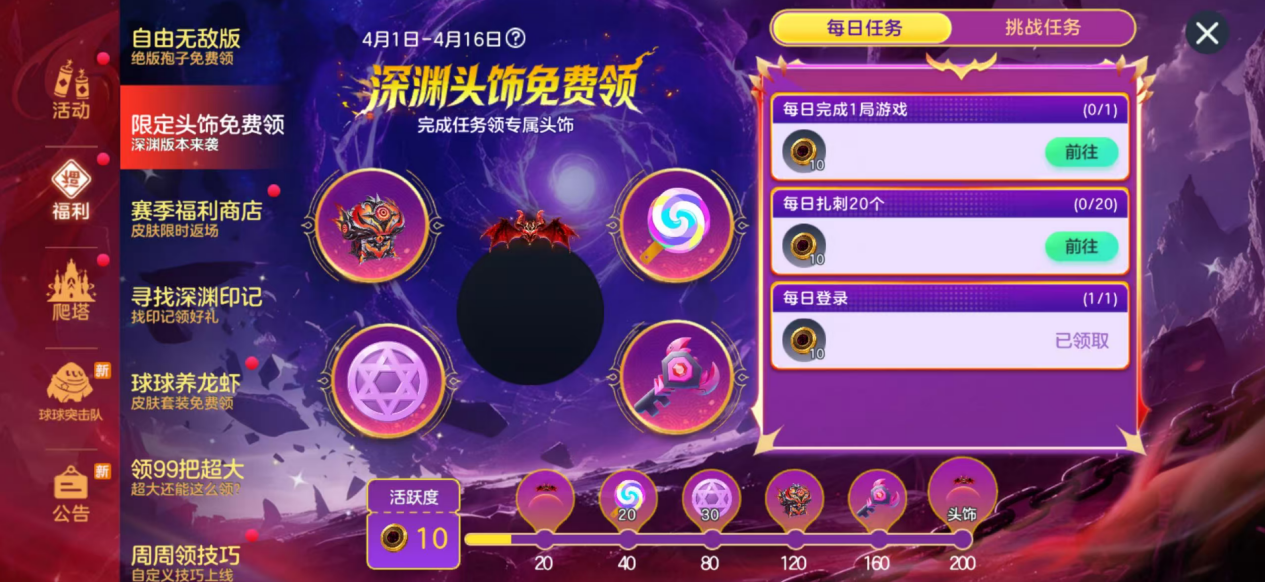 除了这些大动作,今天的波拉哩还有很多细碎的福利等着大家。比如那个「深渊之眼」头饰活动,只要你累计活跃值就能永久领取,现在登录打一局还能先领个7天体验版过过瘾。还有从4月3日开始的“瓜分百亿超大”活动,每天登录就能开超大钥匙红包,最高有机会抽中99把超大钥匙,这运气要是来了,挡都挡不住。