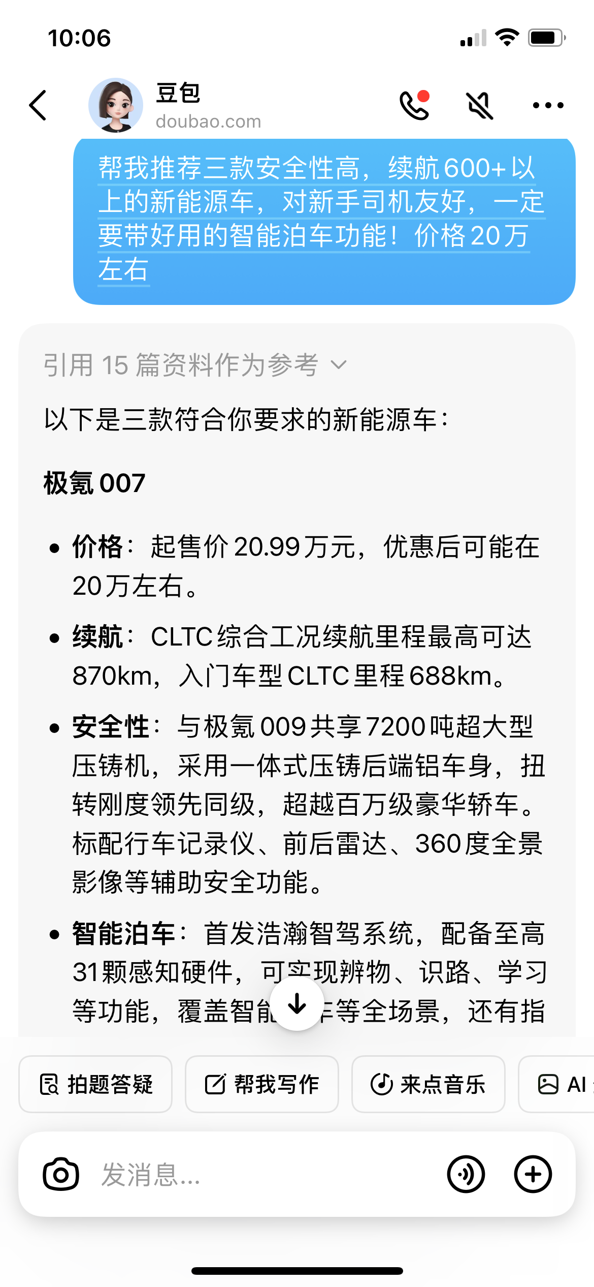 而且感觉豆包给出的参考信息还很全面,不光只给冷冰冰的数据,还能根据用户画像精准匹配用车场景,这比传统选车方式高明多了,怎么形容呢,就像有个懂车的AI闺蜜在帮你参谋!