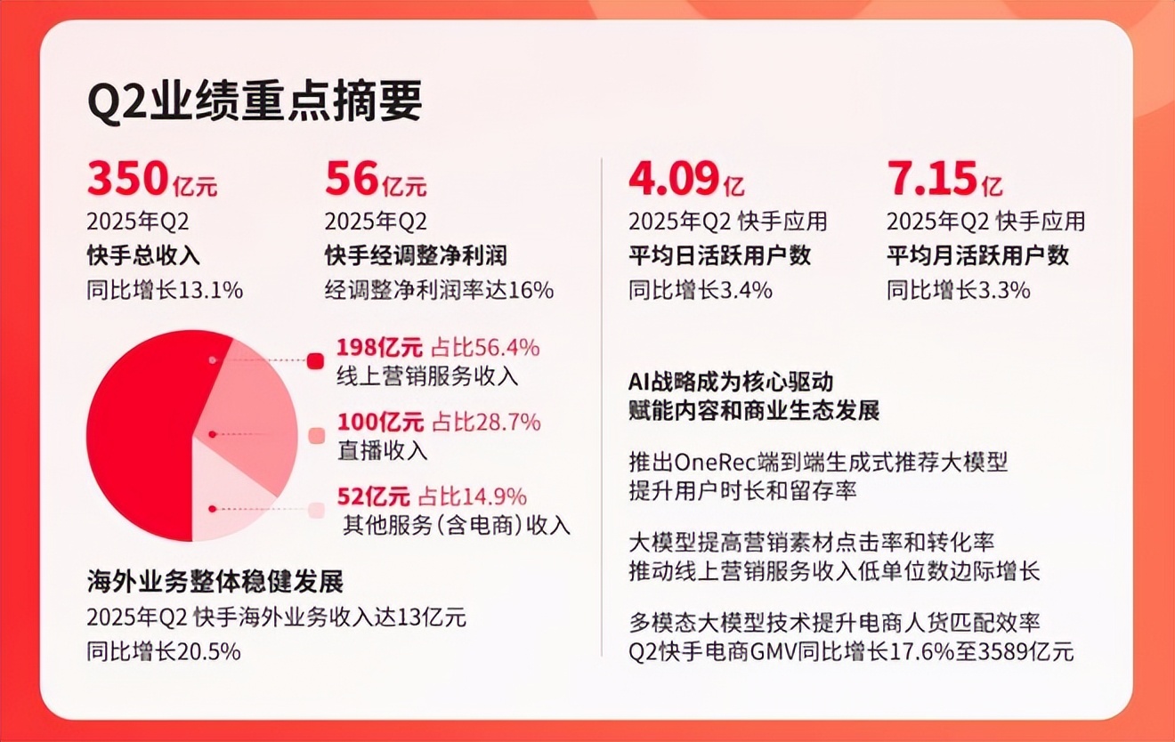 流量上,报告期内,快手平均日活跃用户达4.09亿,同比增长3.4%,平均月活跃用户达7.15亿,同比增长3.3%,用户总使用时长同比增长7.5%。盈利能力上,2025年第二季度,快手营收同比增长13.1%至350亿元,经调整净利润同比增长20.1%至56亿元。毛利率和经调整净利润率双双突破历史峰值,分别达到55.7%和16.0%。