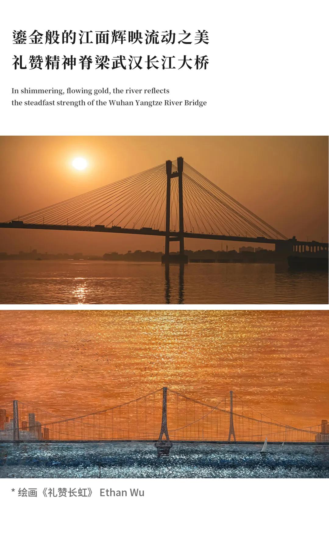 以武汉长江大桥为主体,沐浴于落日余晖之中,采用当代色域绘画的明快语言,以快意的笔触、绚烂的色块,重构这座世纪地标的雄浑与辉煌。既是对城市记忆的深情回望,亦是一场光色交织的现代抒情。