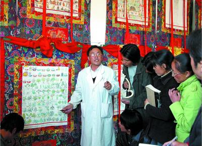 图片说明:曼巴索朗次仁借助曼唐,向学生讲授《四部医典》记载的藏药浴药材。嘎务多吉 摄
