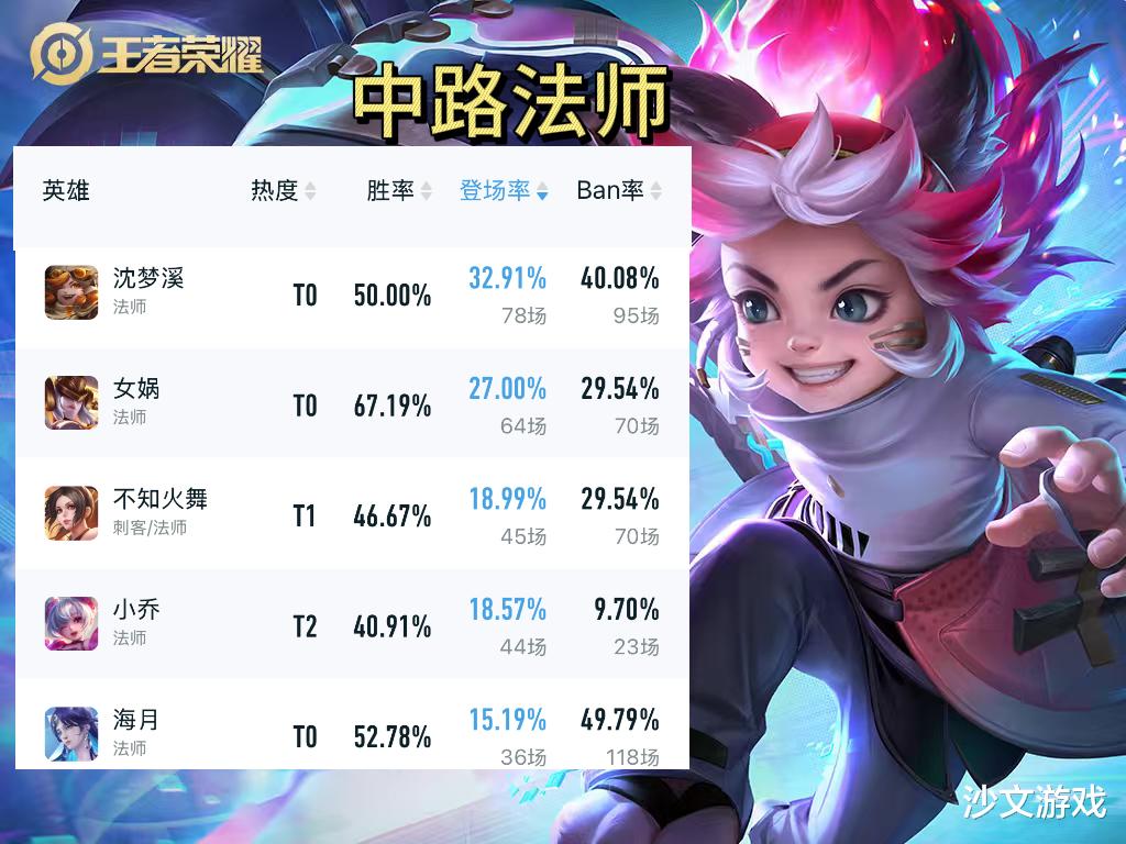 中路法师年度总决赛登场率前Top5的英雄分别是沈梦溪、女娲、不知火舞、小乔、海月。