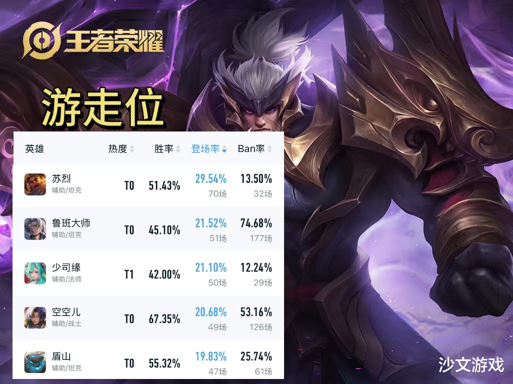 鲁班大师则是ban率最高的辅助英雄,ban率达到74.68%,但是胜率不尽人意只有45.1%,而常与他一同搭配的射手鲁班七号(登场率第六)的胜率更是只有43.24%的胜率。