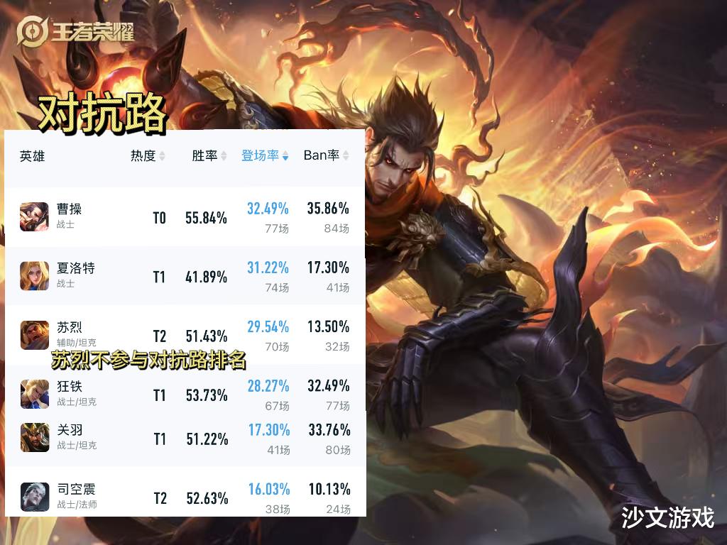 对抗路年度总决赛登场率前Top5的英雄分别是曹操、夏洛特、苏烈(基本都是走游走位不参与对抗路排名)、狂铁、关羽。
