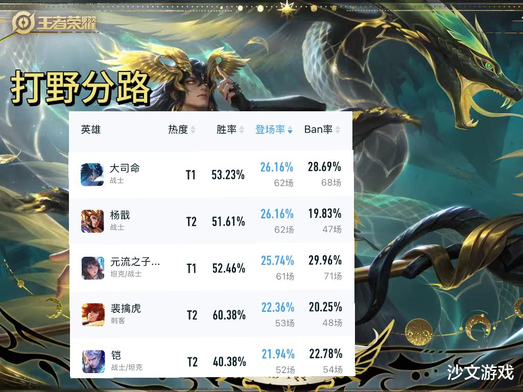 大司命、杨戬、元流之子(战士)的胜率表现都一般,皆在52%左右。